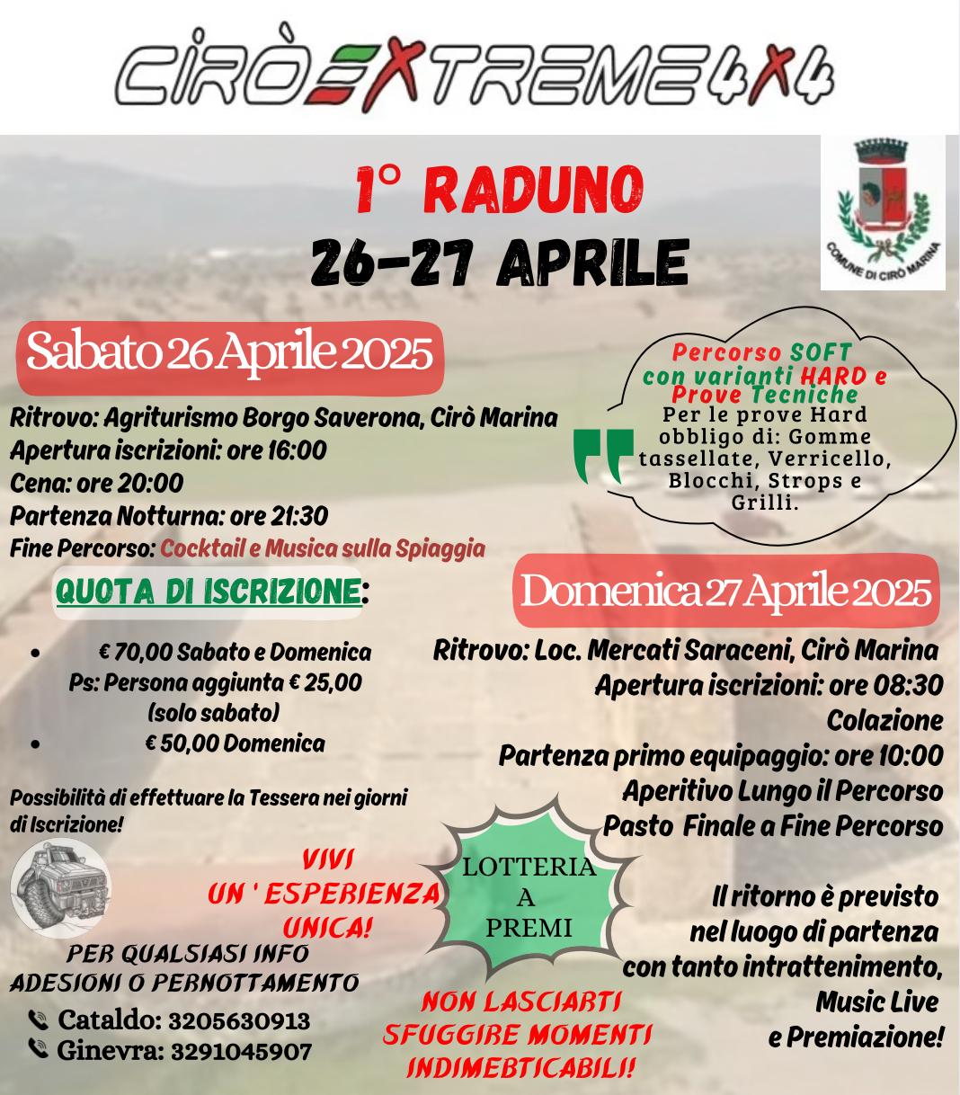Il Cirò Extreme 4×4 Club è lieto di annunciare il suo primo raduno ufficiale, un evento dedicato a tutti gli appassionati del fuoristrada che si terrà nei giorni 26 e 27 aprile 2025. L’iniziativa, che si preannuncia spettacolare, si snoderà tra colline, mare e vigneti del territorio di Cirò Marina, offrendo un’esperienza unica di guida off-road immersa nella natura.