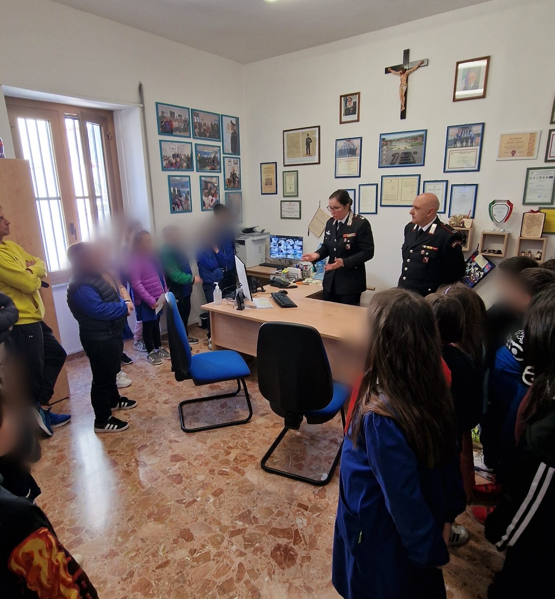 L’incontro è proseguito, per le classi quarte e quinte della scuola primaria, con la visita alla locale Stazione, dove gli alunni hanno posto domande soprattutto relative al ruolo e al servizio svolto dai Carabinieri.