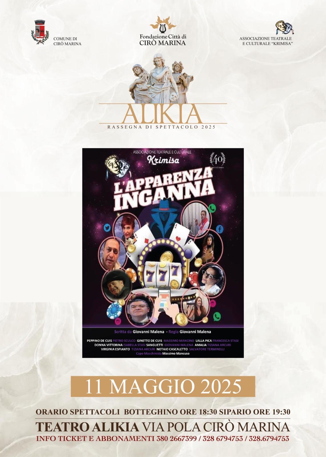 Domenica 11 maggio 2025 il Teatro Alikia di Cirò Marina ospiterà l’attesissimo spettacolo L’apparenza inganna, messo in scena dall’Associazione Teatrale e Culturale “Krimisa”, all’interno della rassegna “Alikia 2025”, promossa dal Comune di Cirò Marina e dalla Fondazione Città di Cirò Marina.