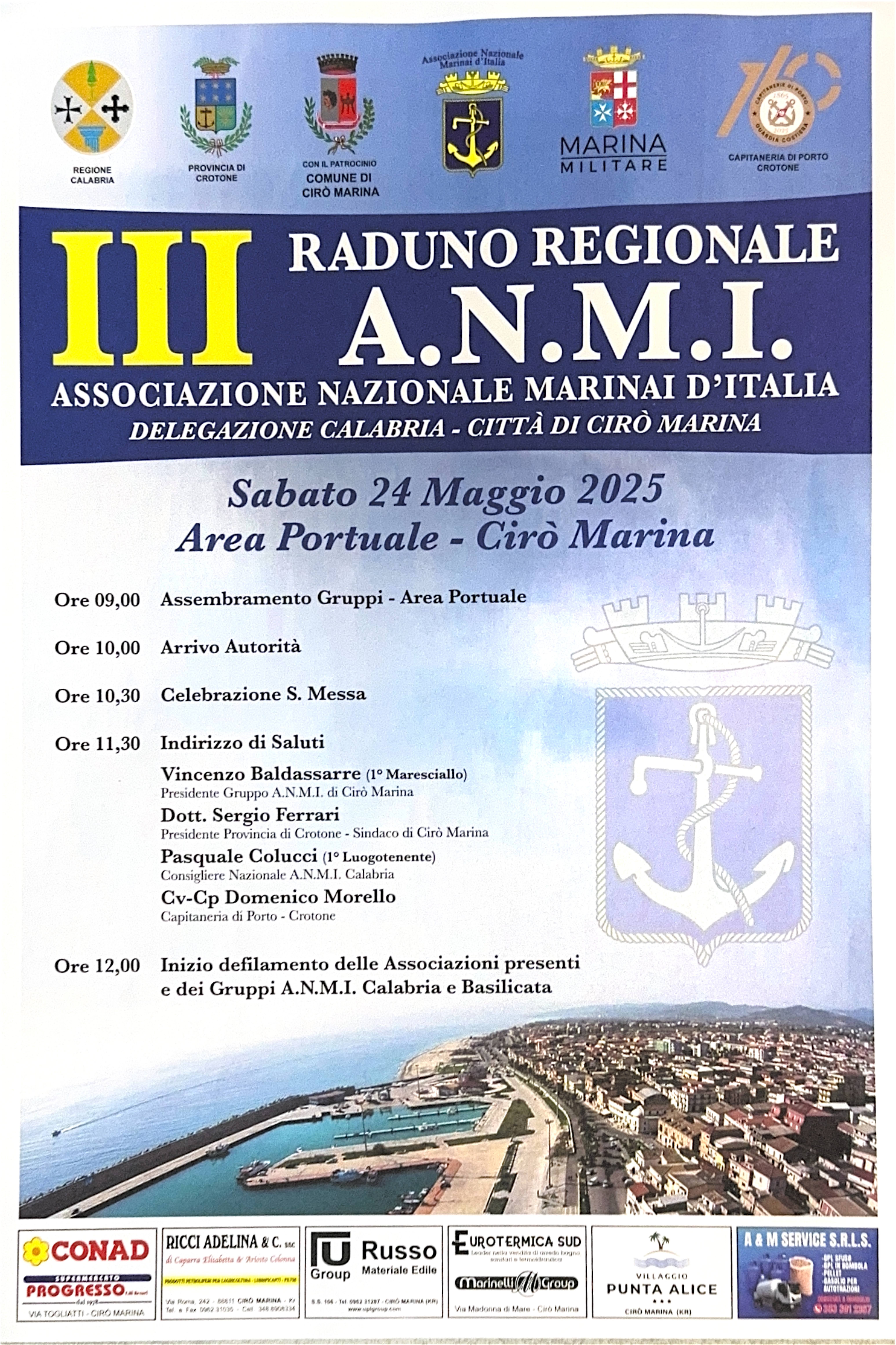 Sabato 24 maggio 2025 l’area portuale di Cirò Marina si prepara ad accogliere il III Raduno Regionale dell’A.N.M.I. – Associazione Nazionale Marinai d’Italia, Delegazione Calabria, in un evento che coniuga solennità, spirito di corpo e partecipazione collettiva.