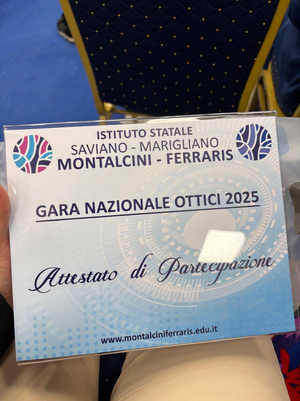 Nei giorni 7 e 8 Maggio 2025, Gloria Parrilla, studentessa della classe 4P dell’indirizzo Ottico, ha rappresentato con orgoglio il nostro istituto alla Gara Nazionale degli Ottici, ospitata presso l’ISS “R. Levi Montalcini – G. Ferraris” di Marigliano (NA).