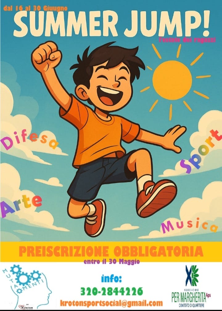 Promosso con passione dal Comitato di Quartiere di Margherita e da MutaMenti, il brand culturale dell’ASD Kroton Sport&Social, SUMMER JUMP nasce dalla collaborazione con atleti, artisti e associazioni del territorio, per offrire un programma ricco, variegato e soprattutto indimenticabile.