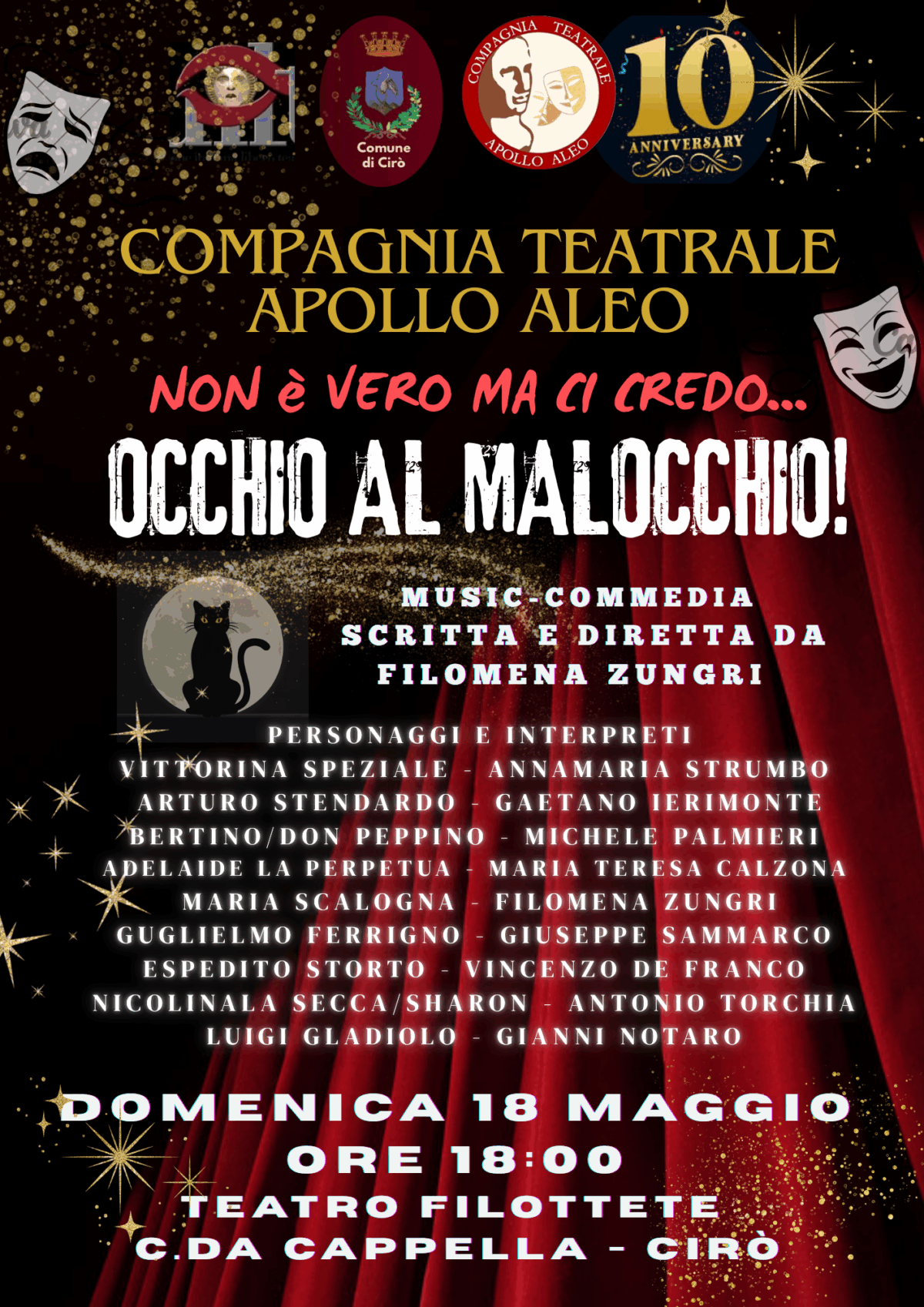 Un decennale tutto da ridere!!! La Compagnia Teatrale “Apollo Aleo” festeggia i 10 anni di attività con una nuova, spassosissima music-commedia che sarà presentata a Cirò, al teatro Filottete, domenica 18 maggio alle ore 18:00, dopo la “prima” al teatro Comunale di Cotronei, per la stagione teatrale 2025, che ha riscosso grande successo. “Non è vero ma ci credo… Occhio al Malocchio” è una commedia brillante in vernacolo calabrese, scritta e diretta da Filomena Zungri, che si dipana tra superstizione e scaramanzia, in un mondo fortemente stereotipato.