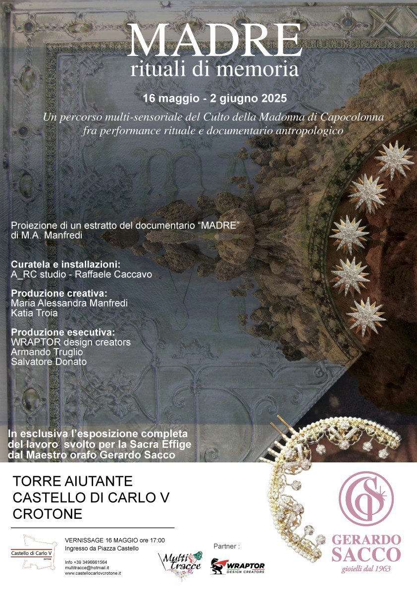 Un pellegrinaggio dell’anima, una devozione commovente, il riferimento certo di ogni cittadino crotonese. Torna, dopo il grande successo dello scorso anno, dal 16 maggio al 2 giugno, la nuova edizione di “Madre – Rituali di memoria”, mostra immersiva e site-specific che ha registrato quasi un migliaio di presenze nel 2024. L’evento, ideato e curato dall’architetto Raffaele Caccavo presso la Torre Aiutante del Castello di Carlo V di Crotone.