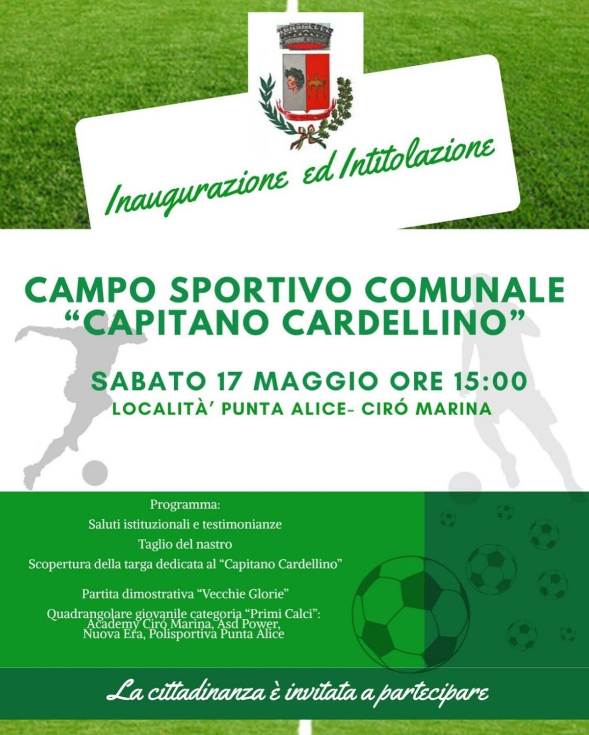 Tutto pronto per un evento molto atteso dalla comunità sportiva e cittadina: sabato 17 maggio 2025, alle ore 15:00, sarà inaugurato ufficialmente il Campo Sportivo Comunale “Capitano Cardellino” in località Punta Alice.