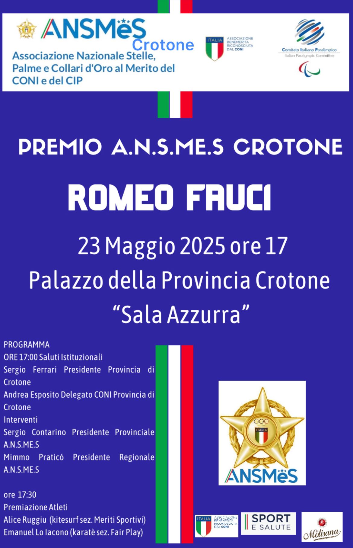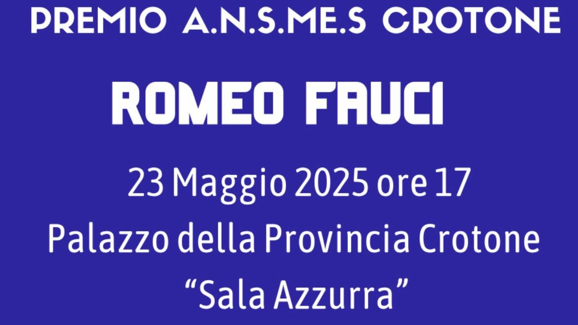 Un tributo al valore, alla lealtà e all’impegno nello sport. Si terrà venerdì 23 maggio 2025, alle ore 17:00, presso la Sala Azzurra del Palazzo della Provincia di Crotone, la cerimonia di consegna del Premio A.N.S.Me.S “Romeo Fauci”, promosso dalla sezione provinciale di Crotone dell’Associazione Nazionale Stelle, Palme e Collari d’Oro al Merito del CONI e del CIP.