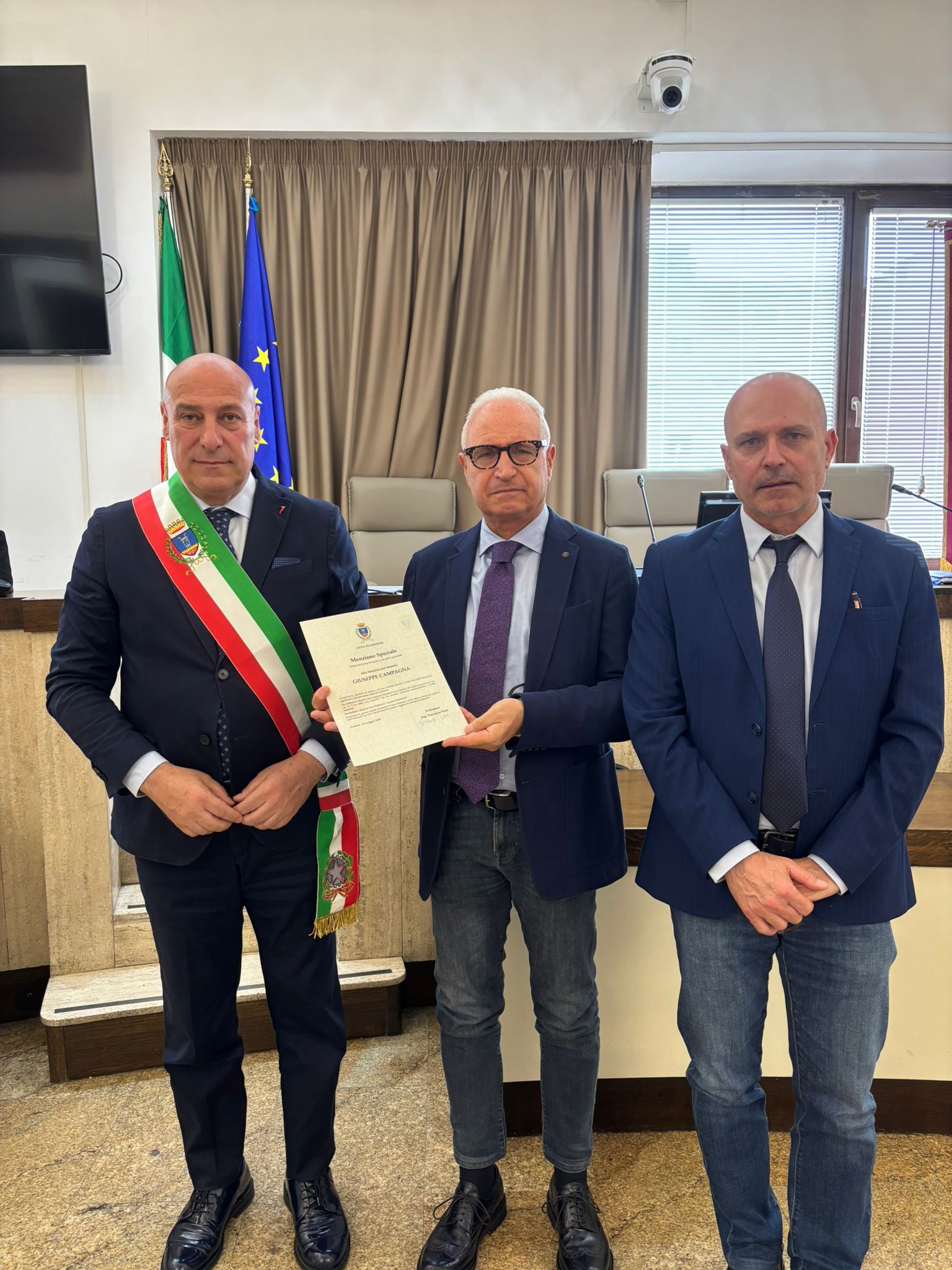 Si sono vissuti momenti di commozione questa mattina nella Sala Consiliare “Falcone e Borsellino” in occasione del conferimento della Menzione Speciale alla memoria del maestro Giuseppe Campagna, l’onorificenza prevista dal Regolamento Comunale per la concessione delle benemerenze civiche.