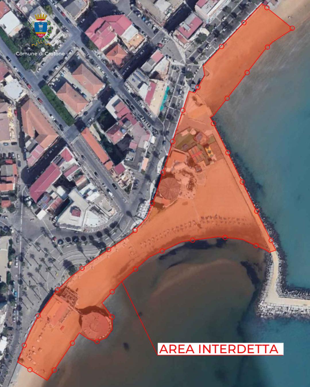 – Interdizione in via cautelativa dalle ore 07:00 del 17.05.2025 e fino alla cessata esigenza e relativa messa in sicurezza, per motivi di tutela della pubblica incolumità, il transito, la sosta e la permanenza a persone, cose, animali ed a mezzi non autorizzati, nell’area demaniale marittima (spiaggia compresa la “passerella”) come meglio individuata nella planimetria allegata