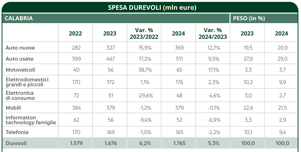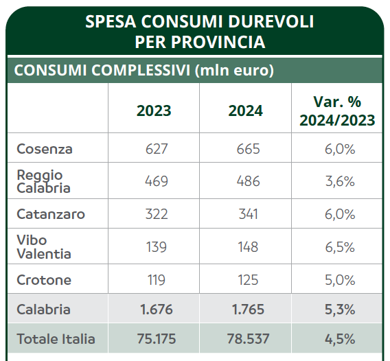 La spesa media in beni durevoli per famiglia è aumentata da 2.048 a 2.156 euro. Fra le province calabresi, Catanzaro e Vibo Valentia si contendono il primato nel livello di spesa per nucleo familiare con 2.256 euro, ma la crescita sul ’23 di Vibo Valentia pari al +6,4% è la migliore. Cosenza invece è la provincia dove si spende di più in durevoli (665 milioni) con un +6% uguale alla crescita di Catanzaro. A Vibo Valentia la variazione, che vale il decimo posto in Italia, è del +6,5%.