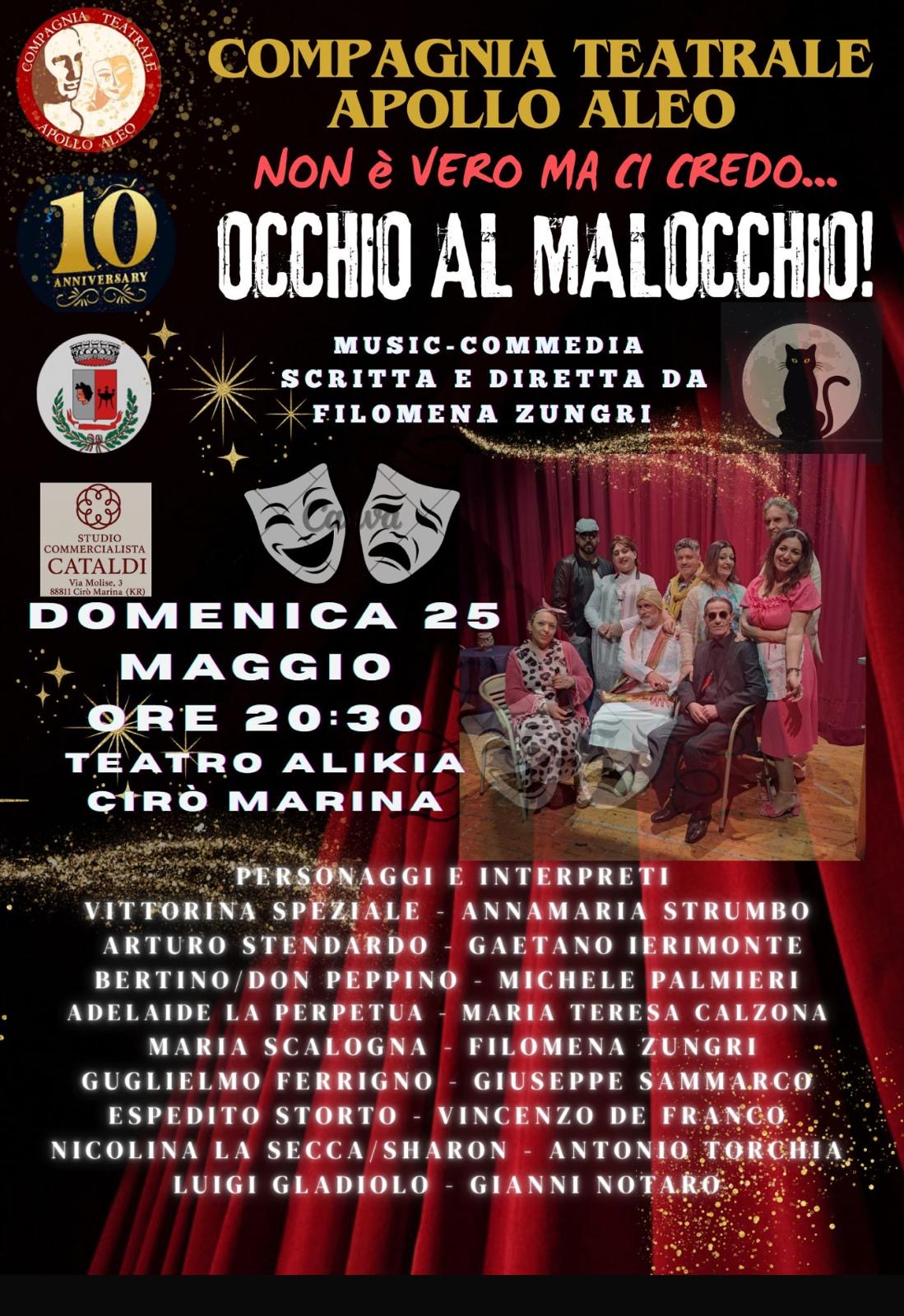 Domenica 25 maggio alle ore 20:30 il sipario del Teatro Alikia di Cirò Marina si alzerà su una nuova, attesissima produzione firmata dalla compagnia teatrale “Apollo Aleo”, che festeggia il suo decimo anniversario con una serata all’insegna della musica, della comicità e del folklore calabrese. In scena, la music-commedia “Occhio al malocchio!”, scritta e diretta da Filomena Zungri.