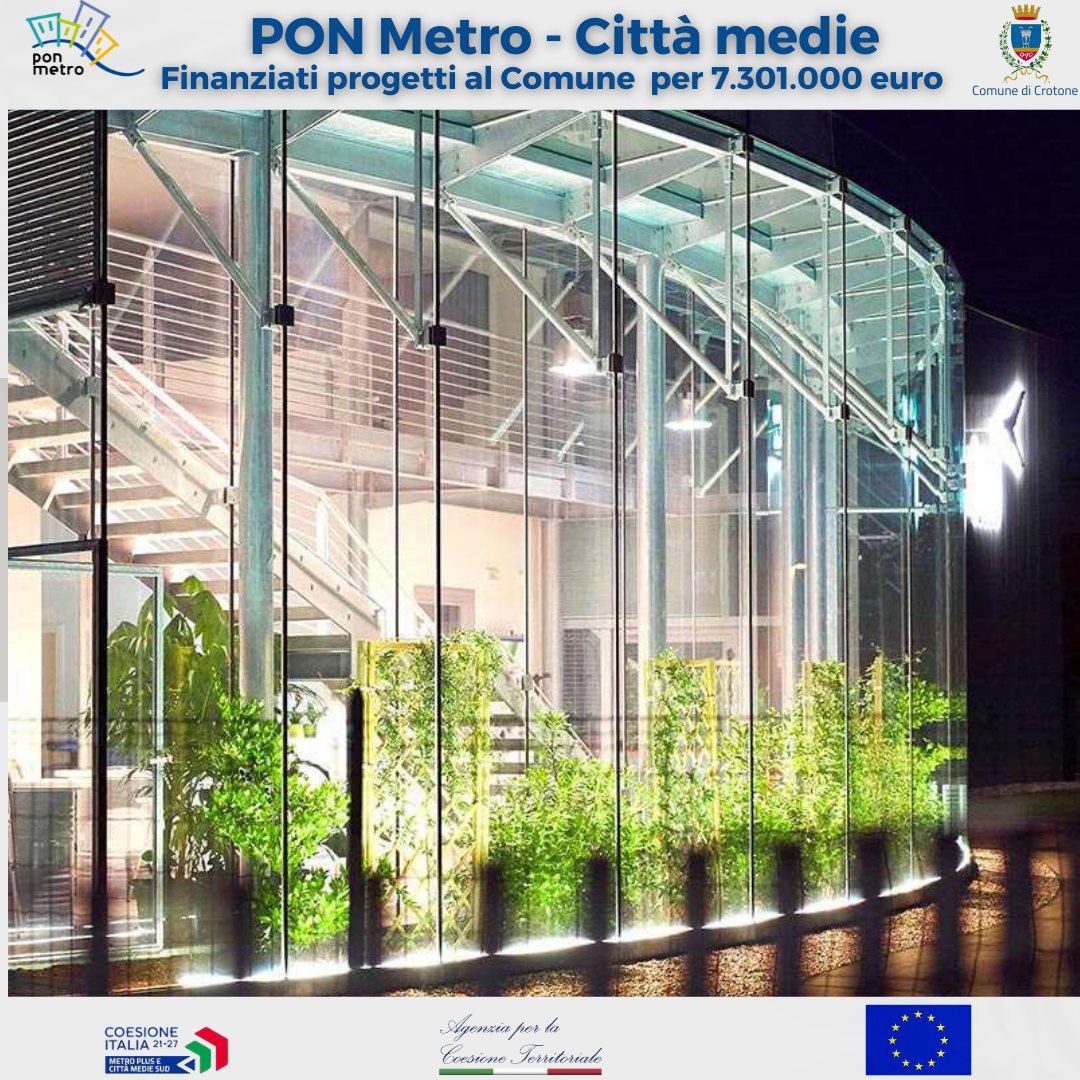 La Giunta Comunale ha preso atto, con proprio provvedimento del decreto di ammissione a finanziamento (7.301.000,00 di euro) da parte della Presidenza del Consiglio dei Ministri Dipartimento per le Politiche di Coesione e per il Sud Ufficio V “Ufficio per le politiche territoriali e la cooperazione territoriale dei progetti presentanti dal Comune di Crotone a valere sulla linea FSE e linea FERS del PON Metro Città Medie.