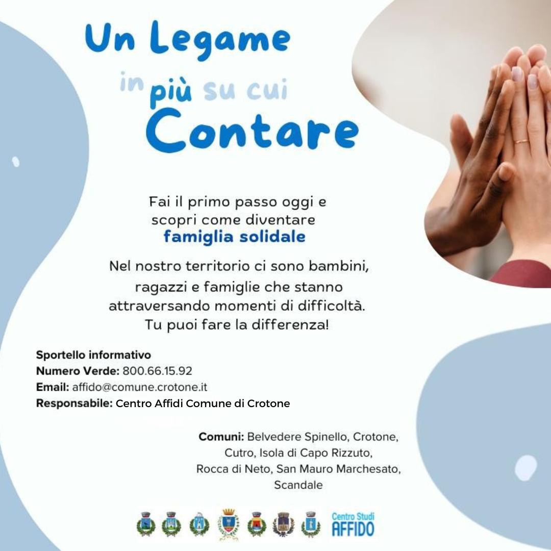 L’Ambito Territoriale Sociale di Crotone, che comprende i territori di Belvedere di Spinello, Cutro, Isola di Capo Rizzuto, Rocca di Neto, San Mauro Marchesato e Scandale e Crotone, comune capofila, in collaborazione con l’Associazione “Centro Studi Affido APS” – dà il via ad un’iniziativa pensata per sensibilizzare e informare la comunità sull’importante tema dell’affidamento familiare e del sostegno alle famiglie in difficoltà.