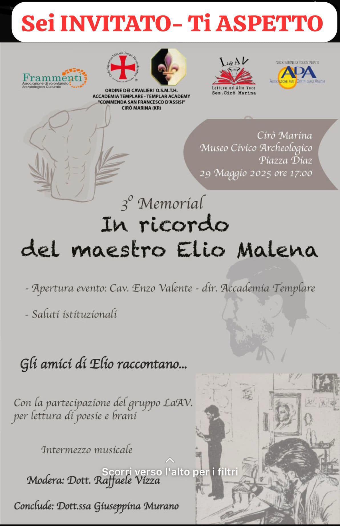 “Ritornare in questo posto magico che è il museo – ha detto – mi emoziona ogni volta, sento la magia, i suoi passi e la voce del Maestro. Per noi templari oggi è un giorno particolare. Questa giornata è dedicata al nostro caro amico e maestro Elio Malena, socio dell’Accademia Templare, ma anche uno stimato storico e profondo conoscitore del nostro territorio.”