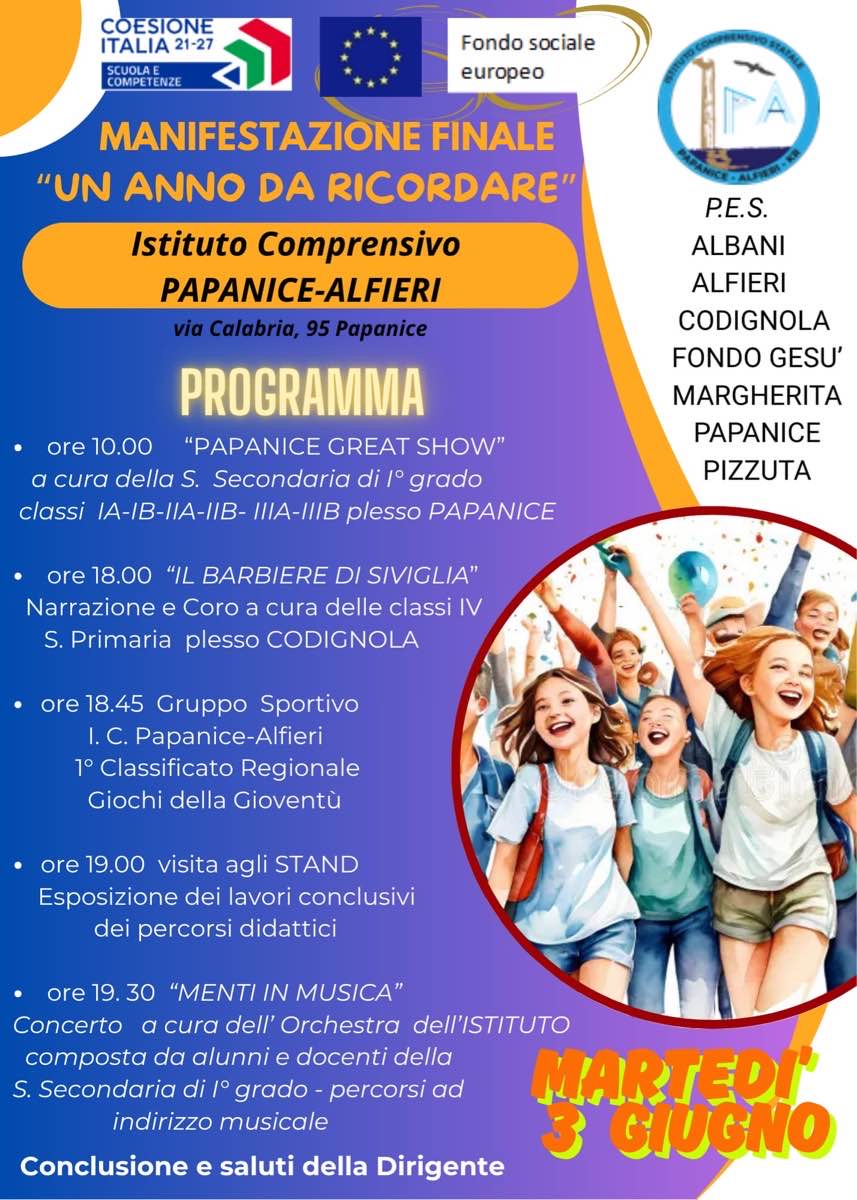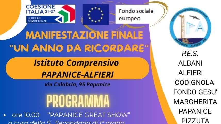 L’Istituto Comprensivo Papanice Alfieri è lieto di annunciare la manifestazione di fine anno scolastico dal titolo “Un anno da ricordare”, che si terrà lunedì 3 giugno 2025, a partire dalle ore 18:00, presso la sede amministrativa dell’Istituto, in viale Calabria n. 95, Papanice.