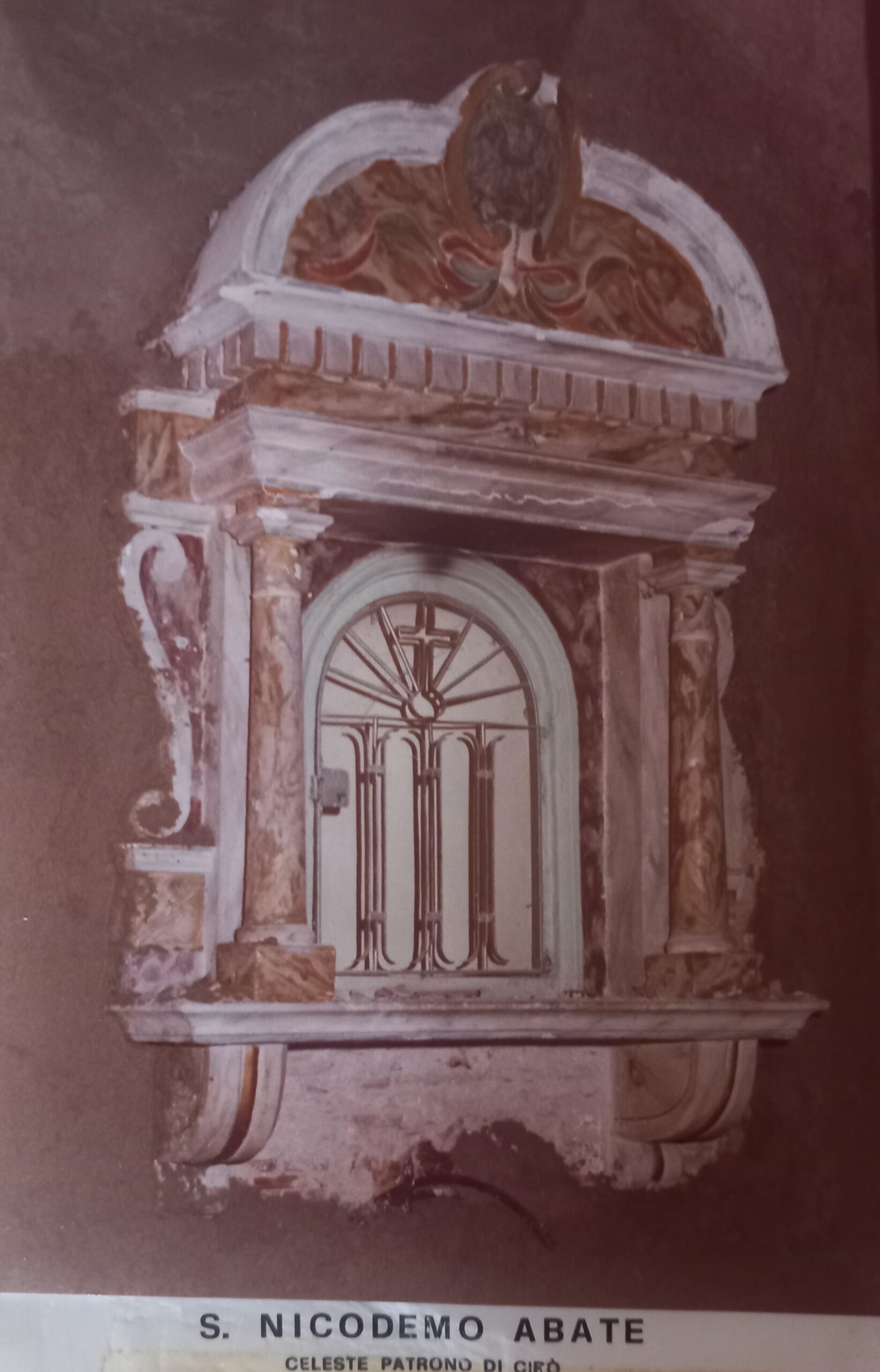 Reliquia consegnata al popolo grazie all’intercessione a Mammola del monaco Apollinare Agresta iniziata già qualche anno prima che morisse, quando il 15 agosto del 1695 scrisse al marchese Carlo Francesco Spinelli di Cirò per la concessione felice della santa reliquia, e al vescovo di Umbriatico. Dunque le reliquie del santo arrivarono a Cirò il 15 gennaio del 1696 al suono di campane e solenne processione, dove il vescovo di Umbriatico ordinò a tutto il clero che ogni anno in questa data fosse celebrata messa solenne e cantata e processione con la statua del Santo Patrono insieme alle sue reliquie per le vie del paese, per rendere solenne questo giorno festivo in onore di San Nicodemo Abate nato a Cirò il 12 maggio del 900 già concittadino e protettore di Cirò.