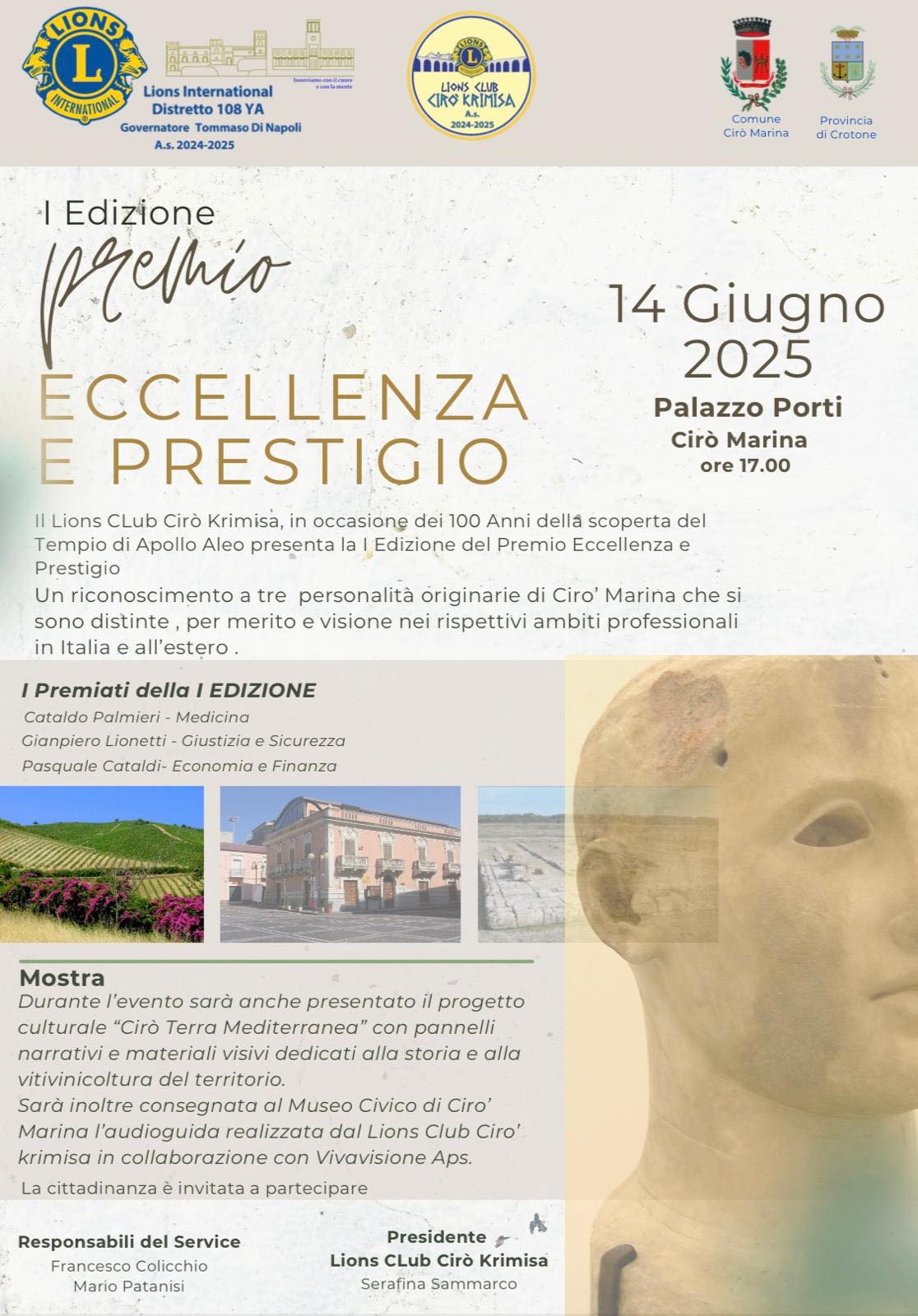 Sabato 14 giugno alle ore 17:00, presso Palazzo Porti, si terrà la cerimonia ufficiale della I Edizione del Premio “Eccellenza e Prestigio”, istituito dal Lions Club Cirò Krimisa per onorare tre figure di spicco, originarie di Cirò Marina, che si sono distinte per merito professionale e valore umano nei campi della medicina, della giustizia e dell’economia.