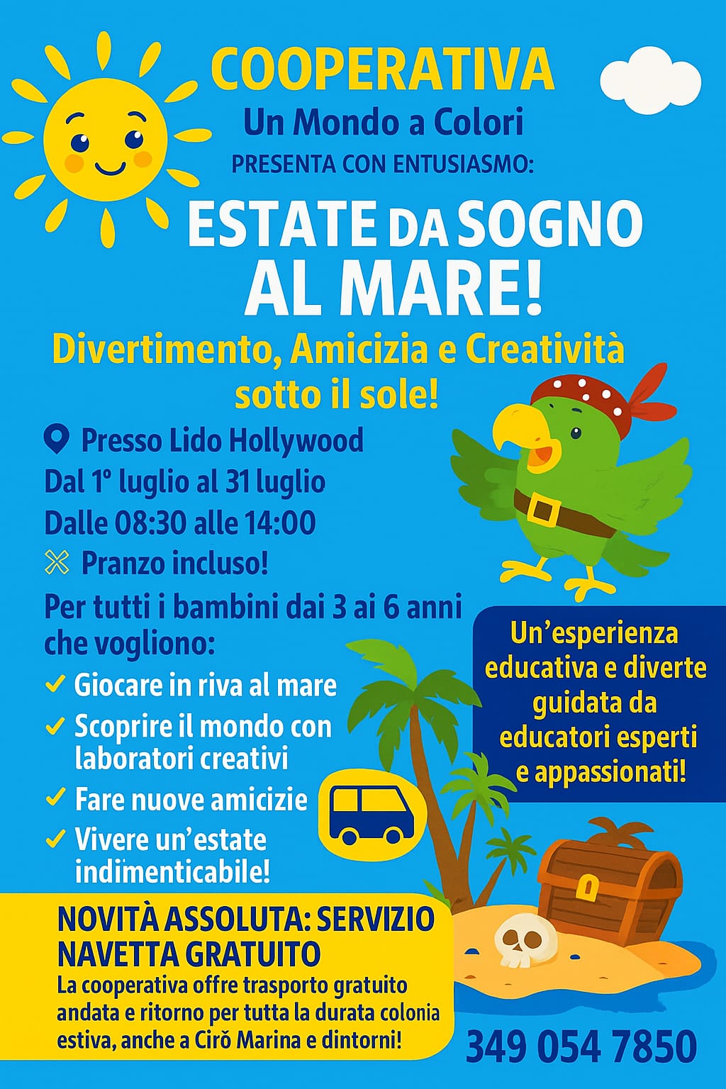 La Cooperativa Un Mondo a Colori lancia con entusiasmo l’iniziativa estiva “Estate da sogno al mare!”, un progetto dedicato ai bambini dai 3 ai 6 anni, che si svolgerà dal 1° al 31 luglio presso il Lido Hollywood. Le attività si terranno ogni giorno dalle 08:30 alle 14:00, con pranzo incluso.