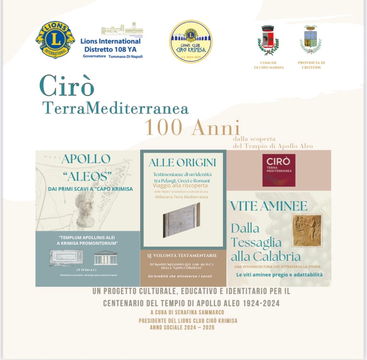 Il Lions Club Cirò Krimisa, in occasione del centenario del ritrovamento del Tempio di Apollo Aleo (1924–2024), ha promosso e realizzato il progetto culturale e divulgativo “Cirò Terra Mediterranea”, con l’obiettivo di raccontare la storia, l’identità e la vitivinicoltura del territorio attraverso un percorso espositivo composto da pannelli informativi e audioguida.