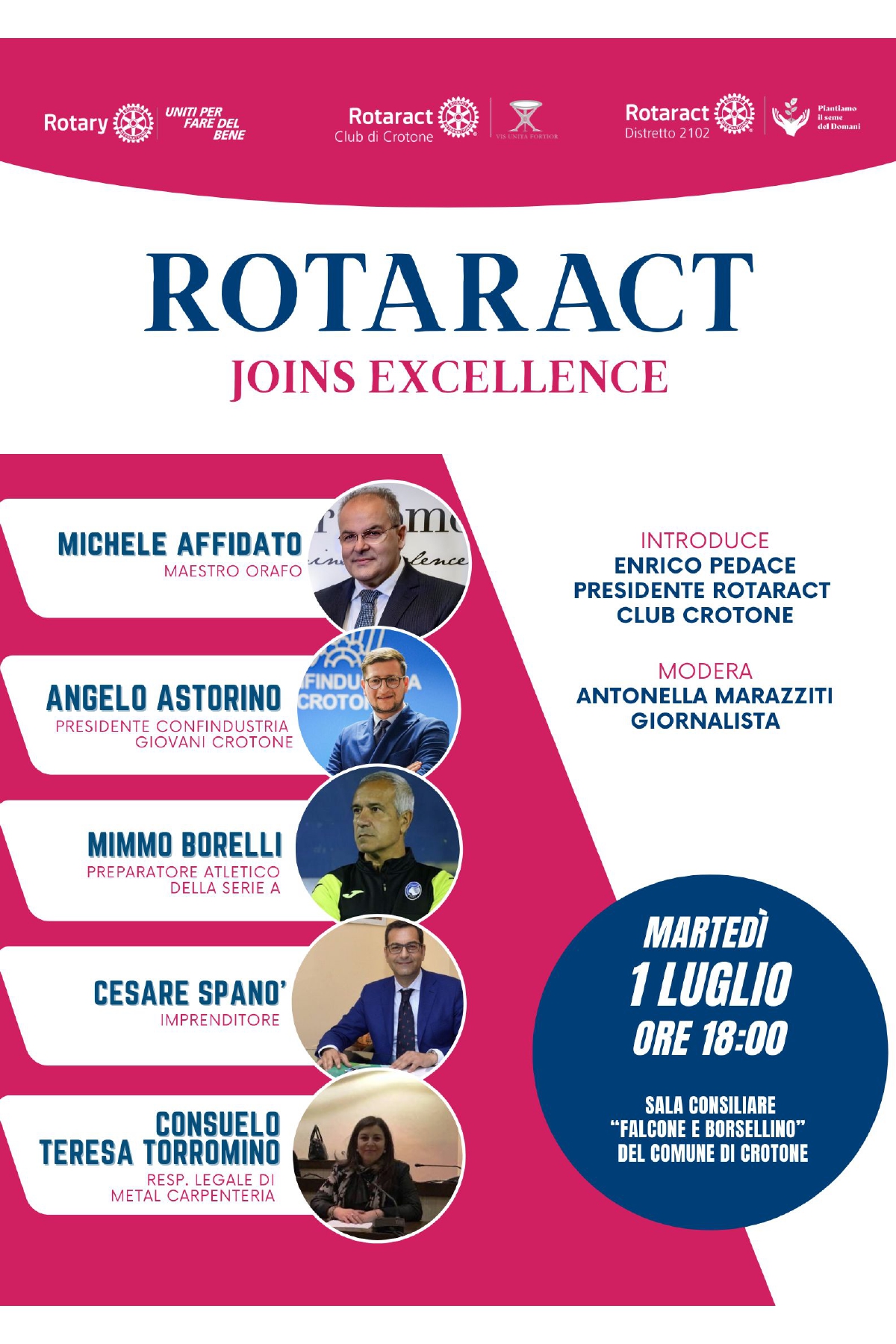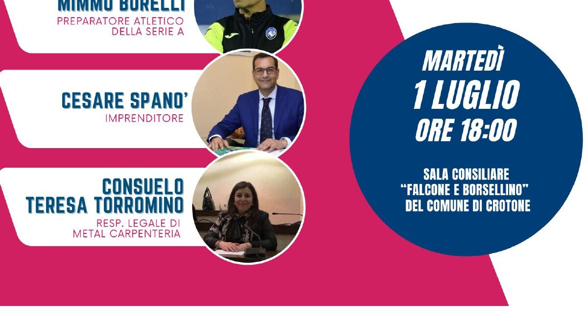 L’incontro sarà introdotto da Enrico Pedace, Presidente del Rotaract Club Crotone, e moderato da  Antonella Marazziti, giornalista, da anni protagonista della comunicazione calabrese, attenta ai temi  sociali e alla valorizzazione del territorio.