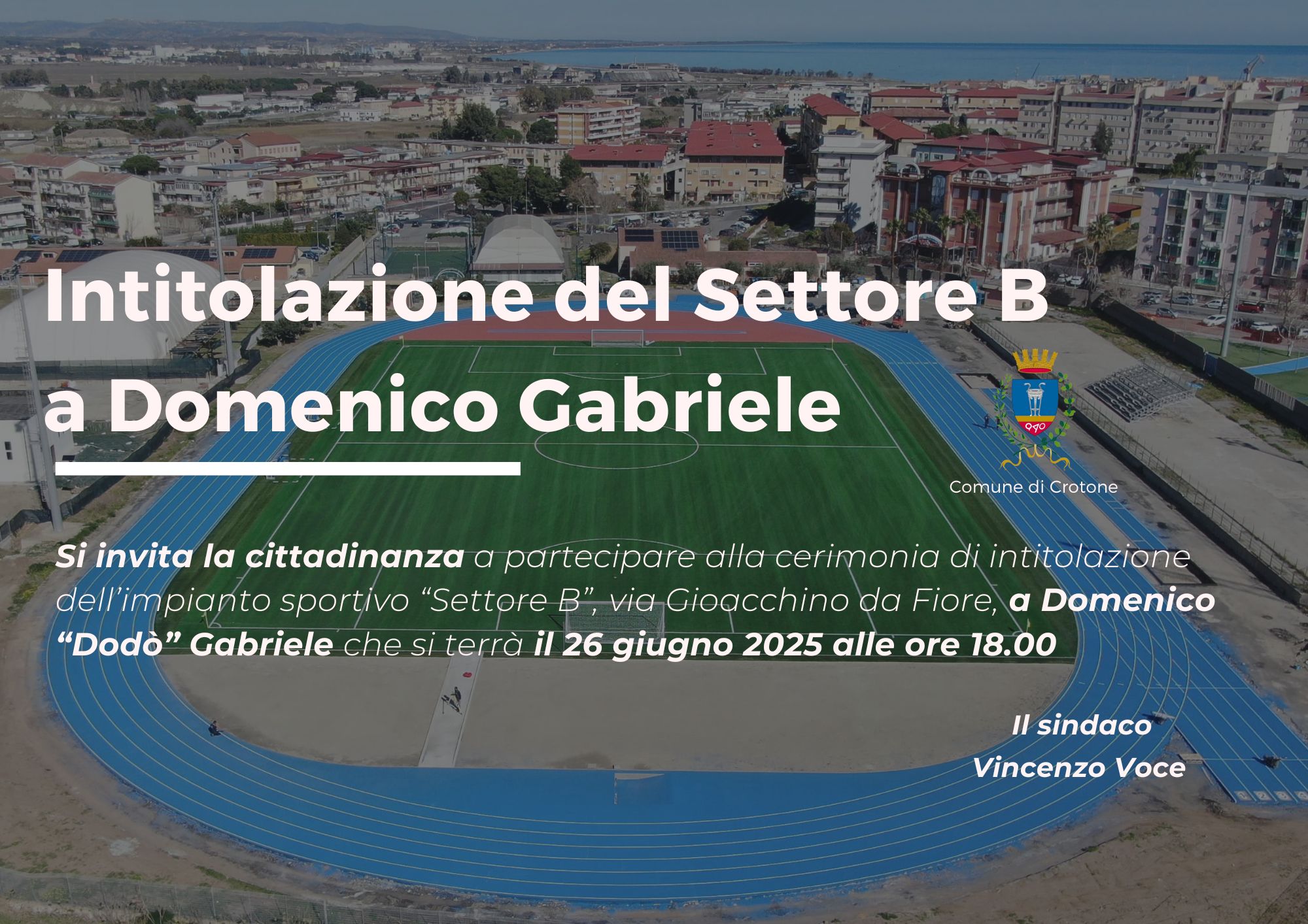 Il prossimo 26 giugno alle ore 18.00 si terrà, alla presenza di autorità civili, militari e religiose, dei genitori, dei rappresentanti di Libera, di associazioni e dei cittadini, la cerimonia di intitolazione del riqualificato “Settore B”, in via Gioacchino da Fiore, a Domenico “Dodò” Gabriele, vittima innocente della criminalità organizzata.