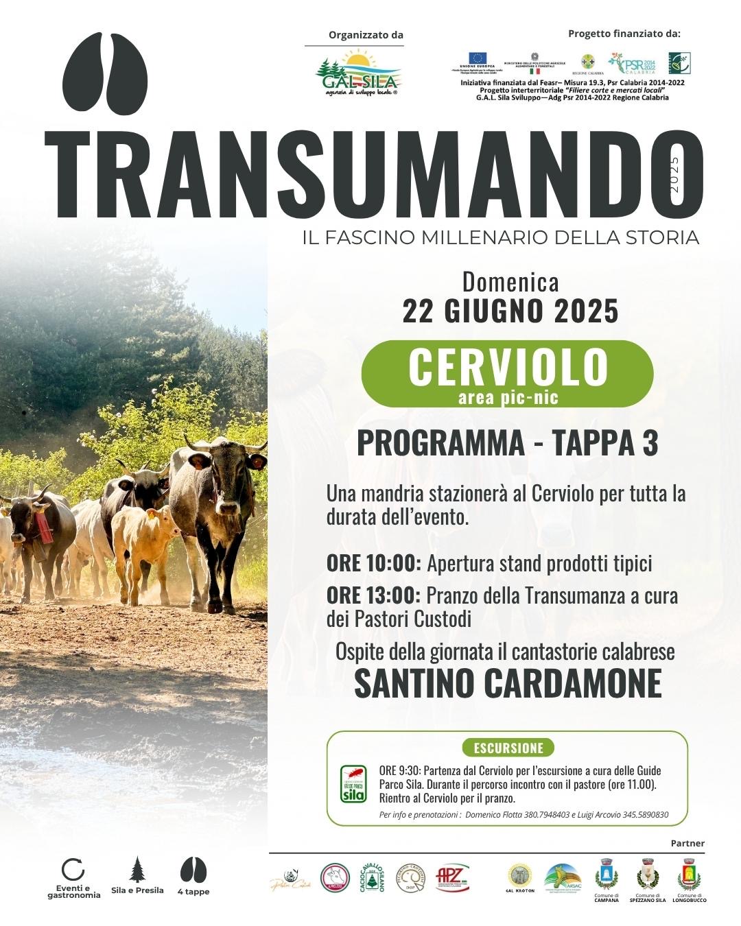 La terza tappa dell’iniziativa si terrà domenica 22 giugno 2025 a Cerviolo, suggestiva località montana del comune di Longobucco. Un’intera giornata a contatto con le mandrie transumanti, i Pastori Custodi e la bellezza incontaminata del paesaggio silano. L’evento prenderà il via alle ore 10:00 con l’apertura degli stand di prodotti tipici e proseguirà alle ore 13:00 con il Pranzo della Transumanza, durante il quale i visitatori potranno gustare formaggi, salumi e preparazioni a base di carne podolica, espressione autentica della tradizione agropastorale della Sila. A rendere ancora più speciale la giornata sarà la presenza dell’ospite musicale Santino Cardamone, cantautore calabrese noto per la sua voce intensa e il suo repertorio popolare e contemporaneo, capace di raccontare il sud e le sue anime più profonde, insieme al gruppo dei Cantori della Transumanza.