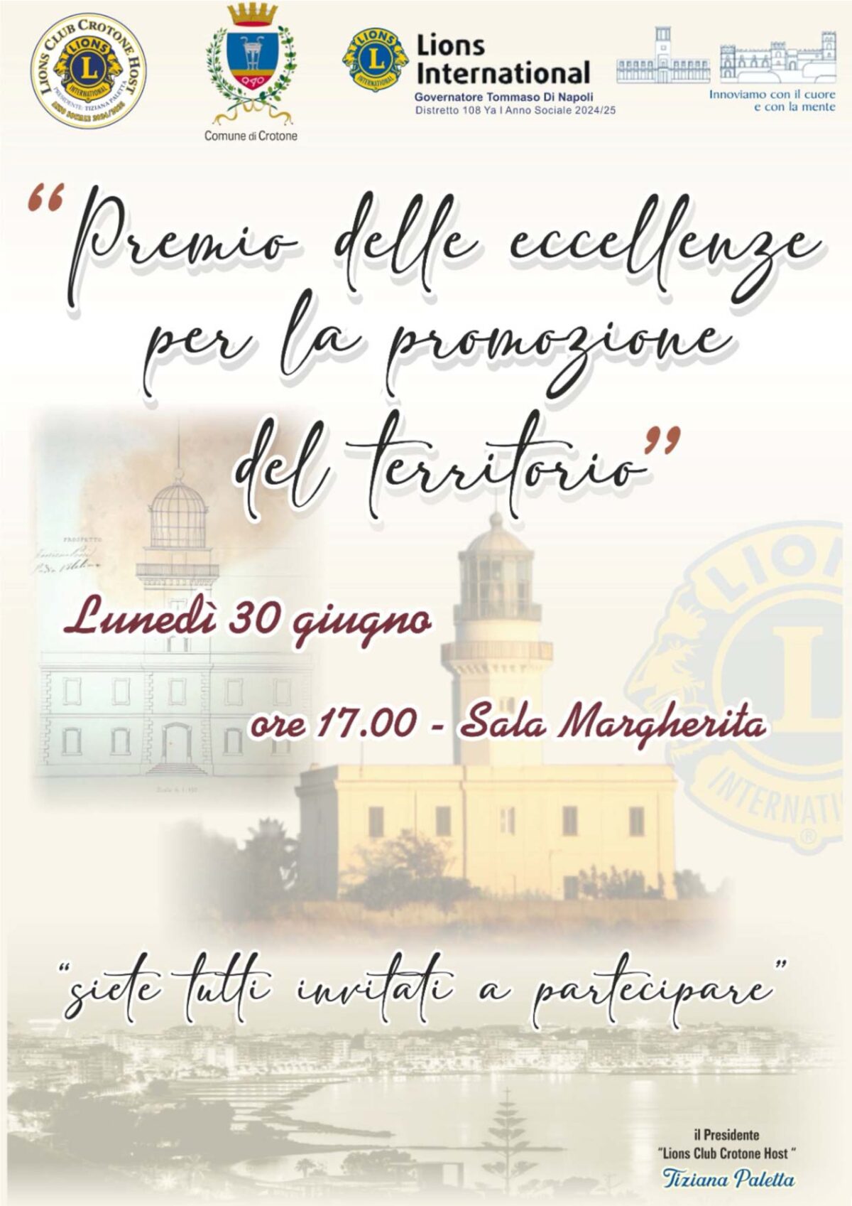 Quale Presidente de Lions Club Crotone Host, sono lieta di comunicarvi e di invitarvi a partecipare al Premio delle Eccellenze promosso dal Club, con il patrocinio del Comune di Crotone che si svolgerà lunedi 30 giugno alle ore 17.00 presso la sala margherita .