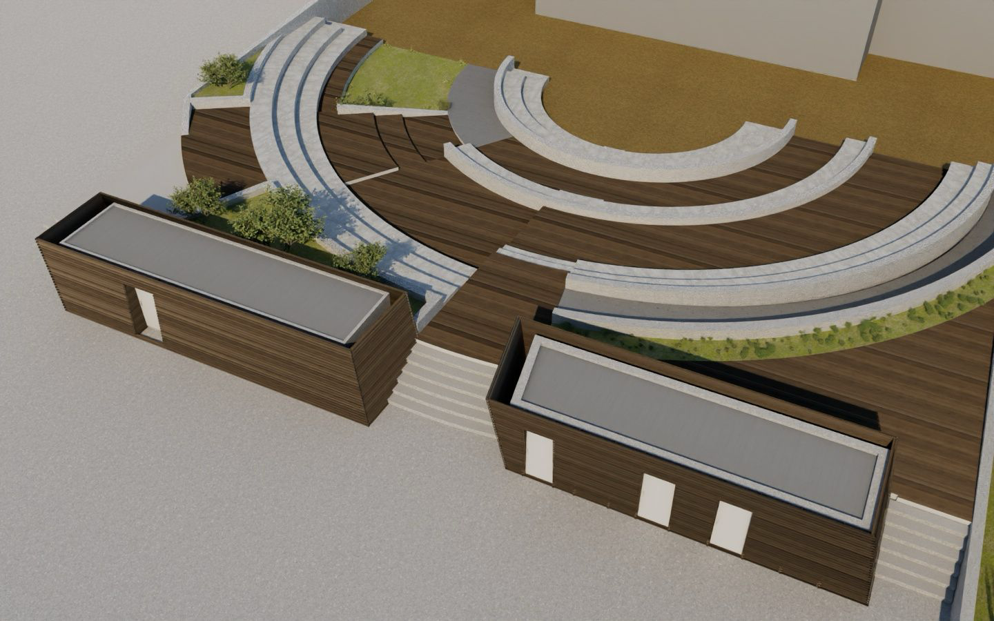 I gradoni concentrici, disposti a partire dal centro della facciata del teatro, daranno forma a una cavea naturale, con il fronte del teatro a fare da scenografia. Lo spazio tra i gradoni e l’edificio fungerà da palcoscenico naturale, adatto ad accogliere performance artistiche di vario genere durante le serate primaverili ed estive.