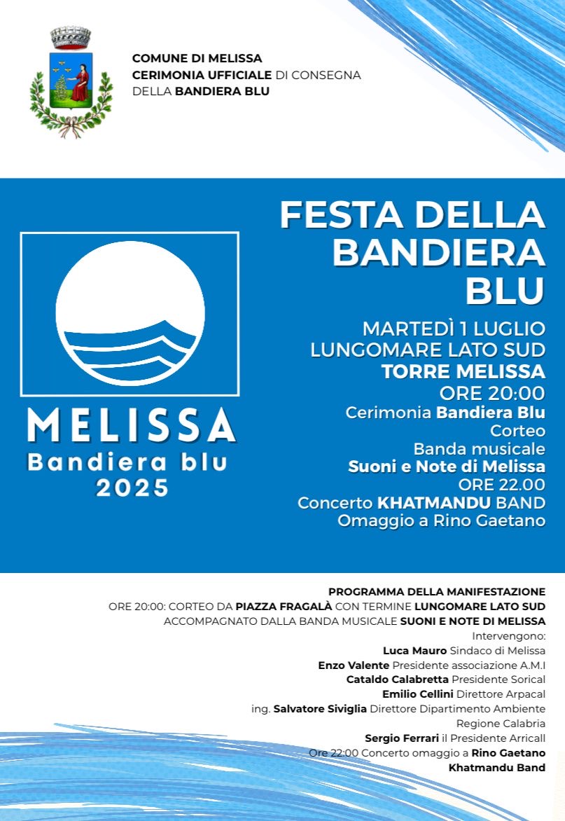 La conquista della Bandiera Blu per il 2025 rappresenta un importante traguardo per il Comune di Melissa, frutto del lavoro congiunto tra amministrazione, cittadini e realtà associative, volto a tutelare l’ambiente e offrire ai visitatori un’esperienza turistica di alta qualità.