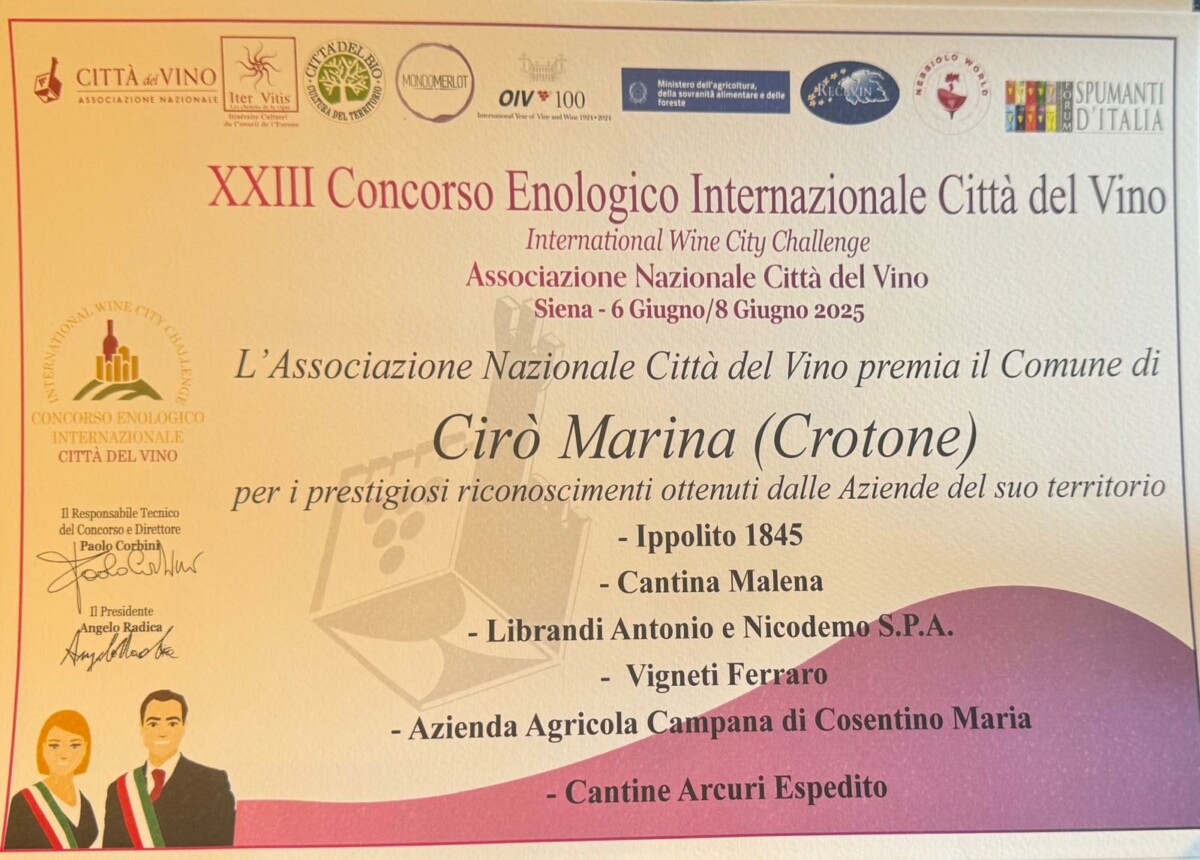 A suggellare ulteriormente l’importanza del riconoscimento, l’Associazione Città del Vino ha conferito un premio al Comune di Cirò Marina (Crotone), per il valore e l’impegno dimostrato dalle aziende del suo territorio. Un attestato di merito che rende onore anche al sindaco Sergio Ferrari, premiato insieme all’intera comunità, per il costante supporto alla filiera del vino e alla valorizzazione dell’identità cirotana.
