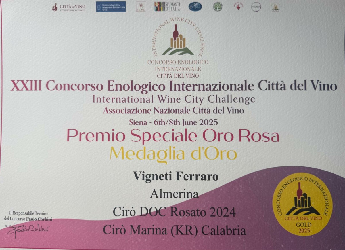 Oggi, 5 luglio 2025, è stato ritirato ufficialmente il prestigioso riconoscimento assegnato all’azienda Vigneti Ferraro nell’ambito del XXIII Concorso Enologico Internazionale Città del Vino, svoltosi a Siena dal 6 all’8 giugno scorsi. L’azienda cirotana ha ottenuto la Medaglia d’Oro con il Premio Speciale “Oro Rosa”, grazie all’etichetta Almerina – Cirò DOC Rosato 2024, che ha conquistato la giuria internazionale per la sua eccellente qualità.
