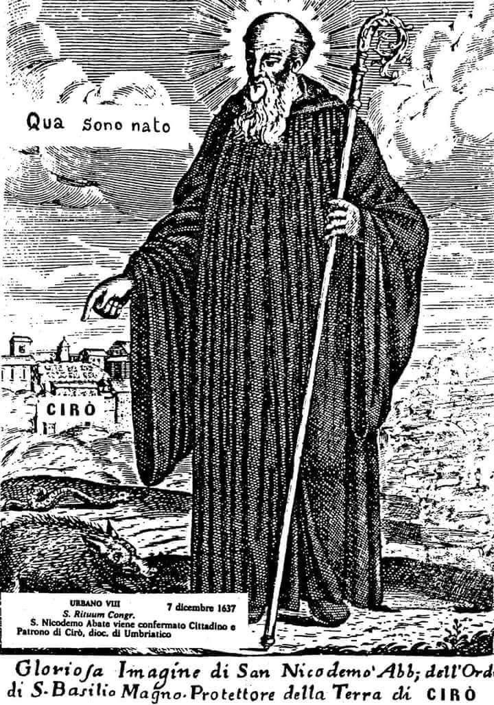 “San Nicodemo Abate è nato a Cirò il 12 Maggio del 900 nell’antico villaggio di Psicrò odierna Cirò la verità in uno dei 25 Bios a lui dedicati” . A sciogliere ogni dubbio sul suo luogo di nascita diversi autorevoli storici antichi e moderni i quali ne sostengono le origini cirotane, della statura di: Abate Apollinare Agresta(1621-1695); Tommaso Aceti (1687-1749); Giovanni Fiore da Cropani (1622-1683); G.F. Pugliese (1789-1855); Antonio Aromolo nel 1901; D. Vincenzo Zavaglia (1906-1974) di Mammola; Antonino Terminelli (1922-2016); P. Francesco Russo (1908-1991). Grazie ai loro studi hanno tolto ogni dubbio sul luogo nativo del Santo annullando le teorie di chi lo voleva nato nel reggino solo perché alcuni autori lessero solo uno delle 25 copie dei bios esistenti sulla vita di San Nicodemo tradotto sotto dettatura dal monaco Daniele , un bios a dire dagli studiosi, pieno di errori, che riportava erroneamente il nome di Sicròs, mentre il monaco Agresta aveva letto senza ombra di dubbio-scrive il dotto Mons Terminelli- un’altra copia dove era riportato il nome Psicrò, termine che lascia poco spazio ad altre forzate interpretazioni. Una soluzione a cui era giunto l’immenso Mons. Antonino Terminelli nel 1979 attraverso uno studio minuzioso riportato nel suo ”Cirò, Patria di San Nicodemo”-estratto da “Studi Meridionali n.4 ” . Il Monaco Agresta nellasua: ”Vita su San Nicodemo Abbate dell’ordine di SanBasilio”- Edito a Roma nel 1677,- scrive Mons Terminelli- afferma senza la minima ombra di dubbio che:” nella provincia della Calabria Citeriore quattro miglia distante dal mare Ionio, nei contorni delle Saline del fiume Neto sortì il nome Nicodemo”. Nel Bios al foglio 245 il Saetta legge:” Ebbe la dimora nelle Saline, in un paese detto Sicròs”, maSicròs non è un paese ma solo il nome di un torrente, un ruscello in un terreno scosceso della locride, da qui l’errore e l’inganno da parte di chi ha voluto costruire una nuova Patria per San Nicodemo diversa da quello indicato dal dotto Agresta, infatti la parola Sicrò, è stato scritto sotto dettatura dal monaco Daniele, un testo pieno di errori. Indubbiamente scrive Mons Terminelli- del Bios di San Nicodemo dovevano esistere copie diverse con numerose varianti. Sicuramente il Bios letto dall’Agresta riportava il nome Psicrò, manoscritto conservato nel Monastero di San Salvatore, dove afferma senza ombra di dubbio, ch’esso è l’originale, e che questo è uno dei 25 copie esistenti presenti nelle biblioteche dei vari monasteri e negli stessi ascetari. Da qui la conferma- prosegue Mons Terminelli- che Psicrò del Bios di Nicodemo non poteva non essere che l’attuale Cirò. Questa convinzione venivainoltre suffragata dal testo che ci viene offerto dal “ Sermo in vitam Sancti Nicodemi”. E comunque precisa Mons Terminelli: anche se dovessimo accettare la variante “Sicros” letta dal Saletta nel Bios, non dovremmo avere difficoltà a riferirla all’attuale Cirò visto che la voce greca di Sicròs sta ad indicare un fenomeno di semplificazione fonetica che lungo i secoli ha portato all’attuale nome di Cirò. Inoltre scriveva Mons. Terminelli:” la causa con Mammola non avrebbe potuto avere senso e significato, se la premessa della veridicità dei natali fosse stata disattesa, perché non fondata o addirittura falsa. Sarebbe stato assai facile all’Università di Mammola aver ragione se Nicodemo non fosse nato veramente a Cirò. Per questo a Cirò venne dato un pezzo della mascelladel Santo, consegnato allora al feudatario Spinelli, che venne conservato in un oratorio scelto proprio perché fu la casa nativa del Santo, dove abitava la famiglia Dima, genitori di San Nicodemo, dove fece i primi miracoli ancora oggi visibili sulla roccia del pavimento. Certi della sua appartenenza e dietro insistenza dei cittadini e del clero nel 1630 Papa Urbano VIII lo proclama Santo Patrono e cittadino di Cirò il 2 Marzo del 1630. Per tutto questo i Cirotani ringraziano il dotto Mons Terminelli per aver sciolto ogni dubbio sulla nascita di San Nicodemo, attraverso la sua scrupolosa ricerca storica.