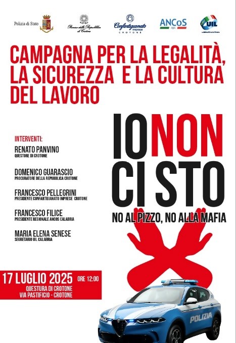 La città di Crotone si prepara ad essere un faro per un’importante e delicato progetto di legalità, e di sicurezza e cultura del lavoro. Giovedì 17 luglio 2025, alle ore 12:00, presso la Questura di Crotone, in Via Pastificio, verranno presentate alla stampa le linee guida per gli imprenditori che aderiscono alla Confartigianato i quali adotteranno un adesivo nelle loro aziende con la seguente dicitura “Io non ci sto – No al Pizzo, No alla Mafia”.