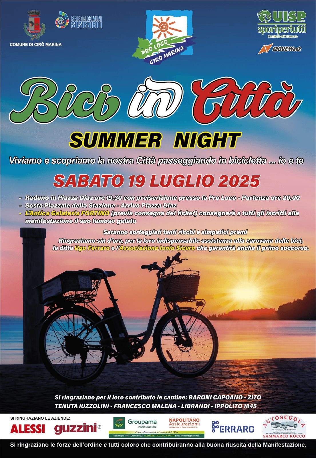 È tutto pronto per la nuova edizione di “Bici in Città – Summer Night”, l’iniziativa estiva organizzata dalla Pro Loco di Cirò Marina, in collaborazione con il Comune e la rete UISP, per riscoprire la città pedalando sotto le stelle. L’appuntamento è fissato per oggi, sabato 19 luglio 2025, con raduno alle ore 19:30 in Piazza Diaz (sede della Pro Loco) e partenza prevista alle ore 20:00.