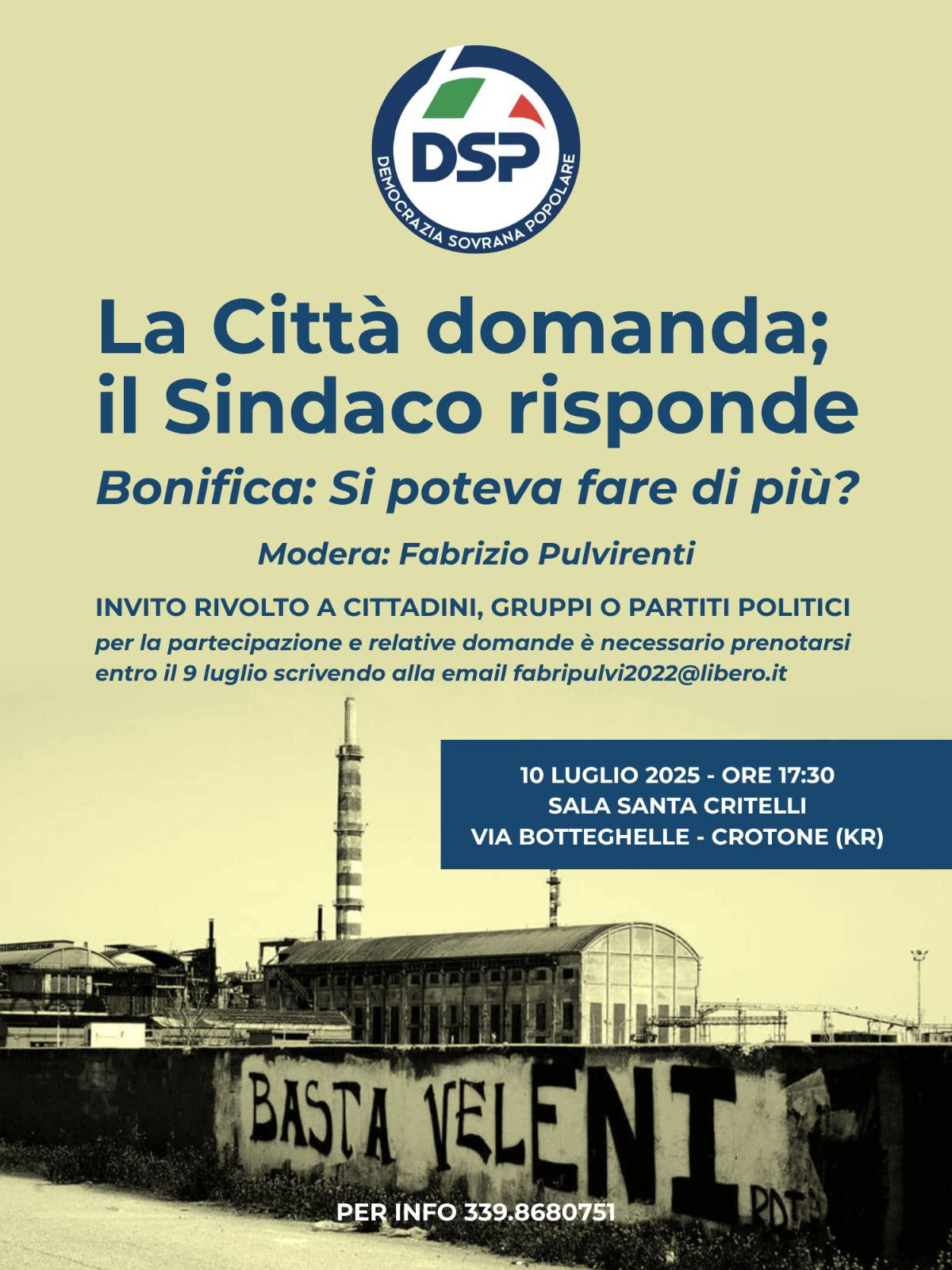 L’augurio di DSP e di Pulvirenti è che i prossimi candidati a Sindaco ci parlino si di bonifica , masoprattutto ci dicano che città immaginano :
