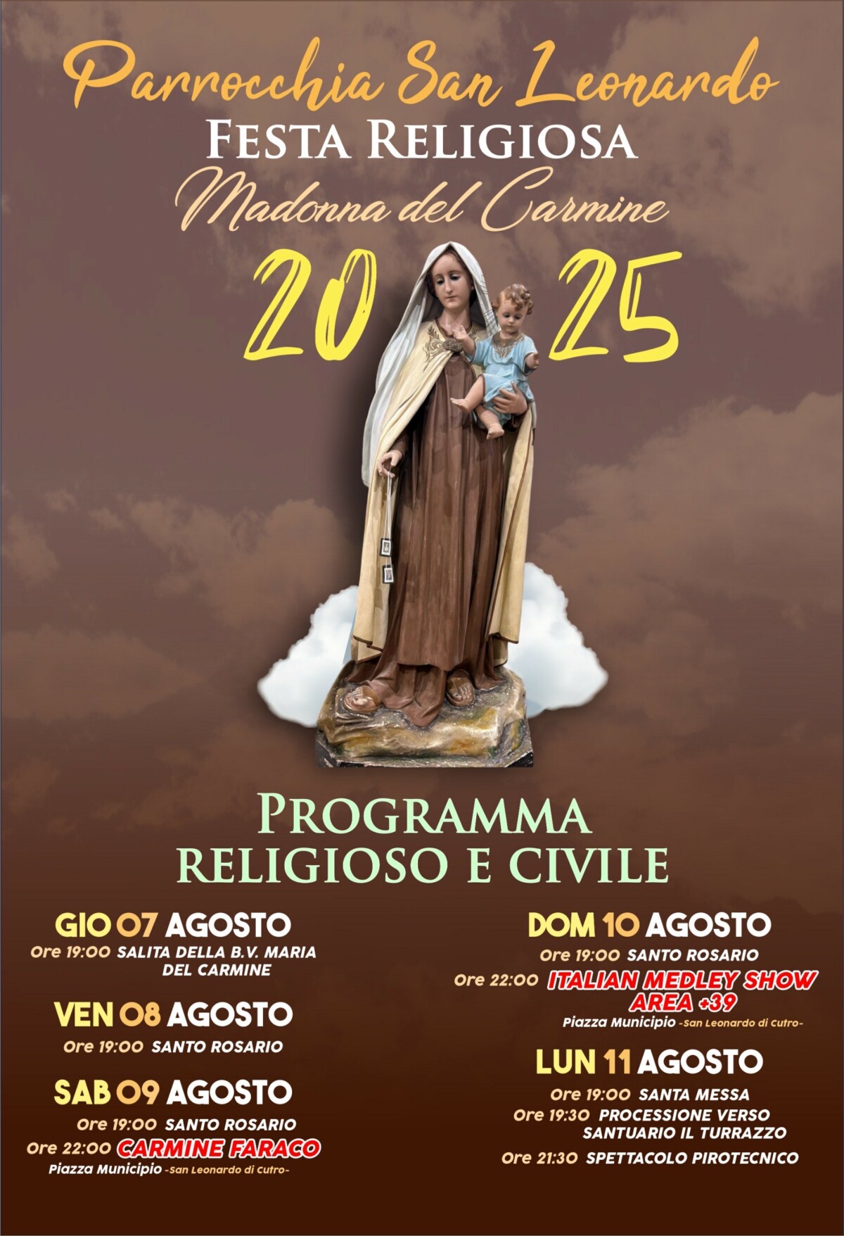 San Leonardo di Cutro – Sarà un agosto ricco di emozioni, spettacolo e tradizione quello che animerà Piazza Municipio in occasione della Festa della Madonna del Carmine 2025.