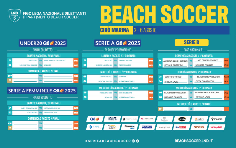 Le giornate dal 2 al 6 agosto saranno invece dedicate alla Serie B, con le Finali Scudetto e i Playoff Promozione. Le squadre si sfideranno in una fase a gironi e successivi incroci, con l’obiettivo di conquistare la promozione nella massima serie.