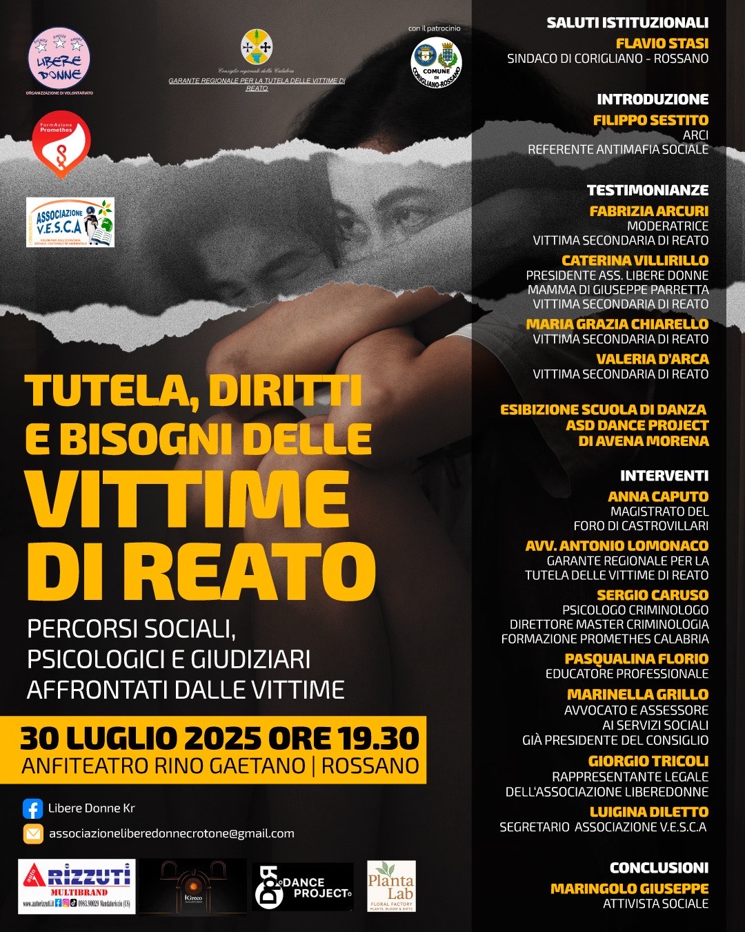 Quando la giustizia resta impigliata nelle pieghe del rito e le istituzioni smettono di ascoltare, rimangono i volti e le parole di chi la violenza l’ha subita sulla pelle e nei legami: madri che non hanno più figli, ragazze sfuggite a un femminicidio, familiari che vivono la stessa pena senza aver commesso alcun delitto. Proprio quelle voci – vive, talvolta incrinate dall’emozione ma mai domate – saranno al centro del convegno “Tutela, diritti e bisogni delle vittime di reato – percorsi sociali, psicologici e giudiziari affrontati dalle vittime”, in programma mercoledì 30 luglio alle 19.30 nell’anfiteatro “Rino Gaetano” di Rossano, su iniziativa dell’Associazione Libere Donne con il patrocinio del Comune di Corigliano‑Rossano e del Garante regionale per la tutela delle vittime di reato.