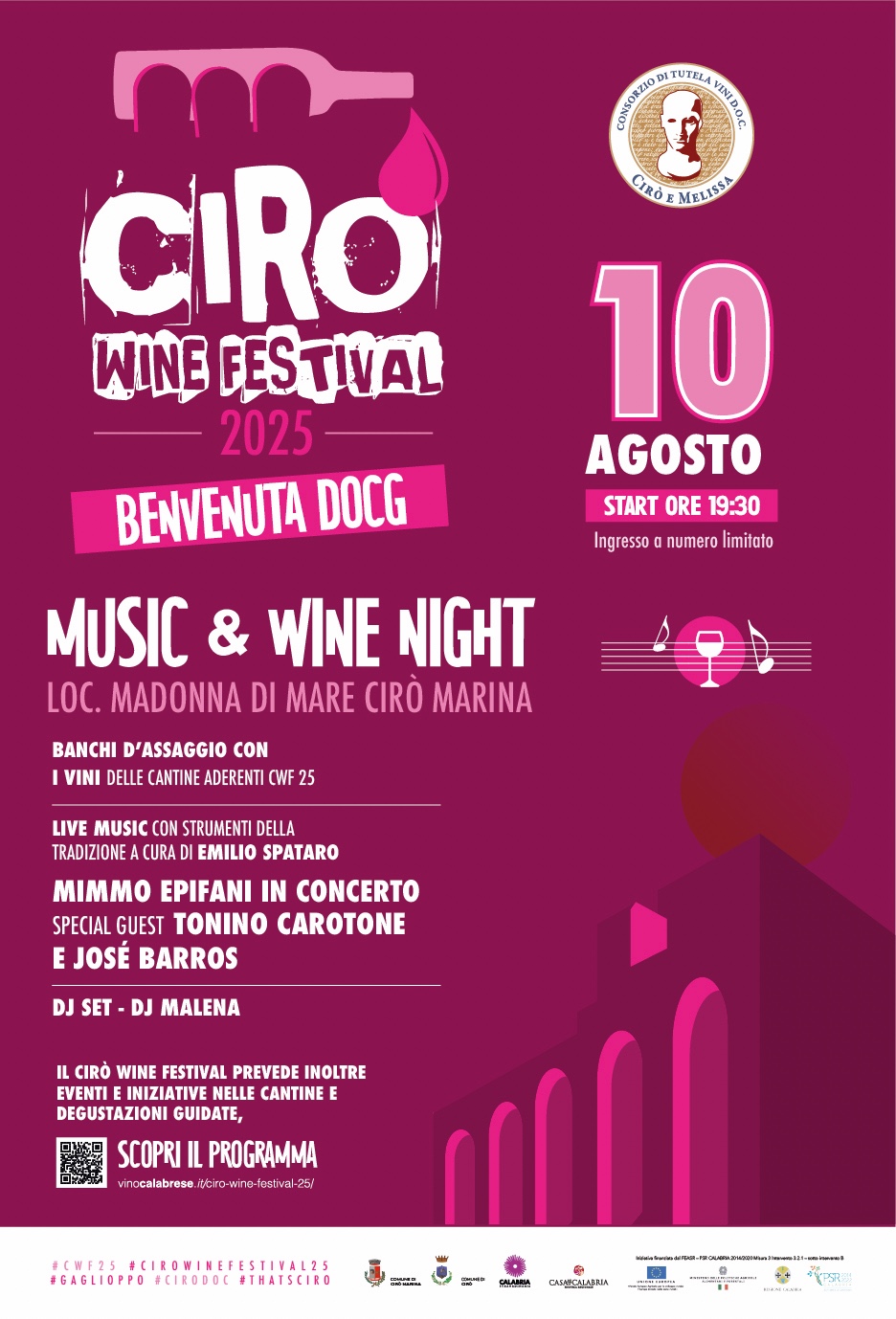 ASPETTANDO LA WINE NIGHT Ad arricchire il carnet degli eventi anche le tre serate in altrettante cantine del territorio che segneranno il cammino di avvicinamento alla Wine Night del 10 agosto a Madonna di Mare. Nella cornice suggestiva dei Mercati Saraceni si potranno degustare i vini di ‘A Vita, Antichi vigneti Sculco, Baroni Capoano, Brigante vigneti & cantina, Cantina Campana, Cantine Arcuri, Cantine Bruni, Cantine De Mare, Cantine Greco, Cantine Malena, Cantine Strangi, Caparra & Siciliani, Cerminara, Enotria, Feudo Liguori, Fezzigna, Fratelli dell’Aquila, Giuseppe Pipita vini, Ippolito 1845, L’Arcigilione di Cataldo Calabretta, La Pizzuta del Principe, Librandi, Maddalona del Casato, Mimmo Vinci, Rocco Pirito, Romano & Adamo, Salvatore Caparra vini, Scala vigneti e cantina, Senatore vini, Sergio Arcuri, Tenuta del Conte, Tenuta Renda, Tenuta Santoro, Vigneti Ferraro, Vigneti Vumbaca, Zitocantine protagoniste dell’edizione 2025 del Cirò Wine Festival.