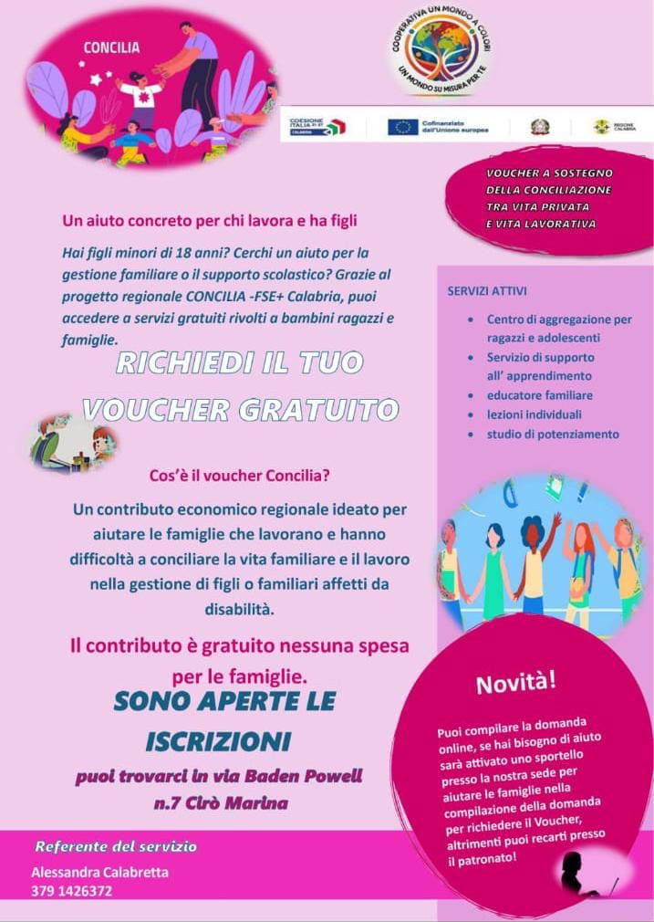 Cirò Marina – Un aiuto concreto per chi lavora e ha figli arriva grazie al progetto regionale “CONCILIA – FSE+ Calabria”, organizzato dalla Cooperativa “Un Mondo a Colori”, che offre alle famiglie la possibilità di accedere a servizi gratuiti dedicati a bambini, ragazzi e genitori.