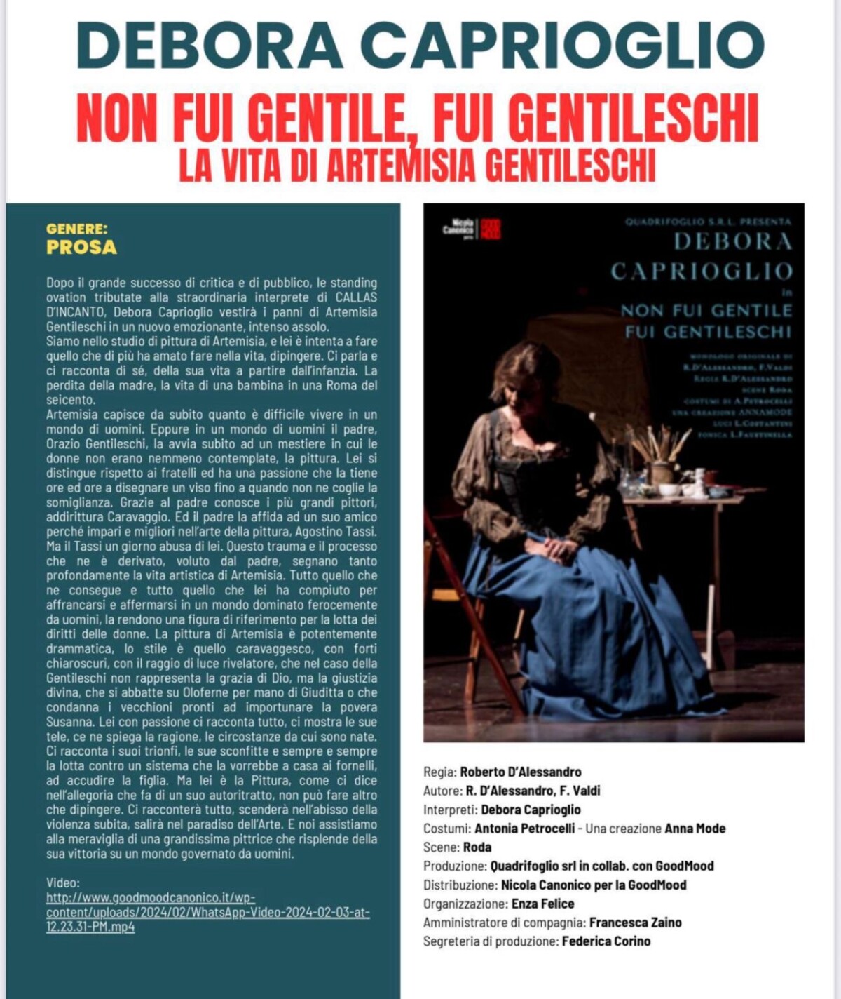 Debora Caprioglio dà voce a una figura combattente, simbolo della lotta per i diritti delle donne e della dignità artistica femminile. Con intensità e passione, lo spettacolo alterna momenti drammatici a lampi di verità universale, restituendo al pubblico il ritratto di una donna che, contro ogni ostacolo, seppe conquistarsi un posto nella storia dell’arte.