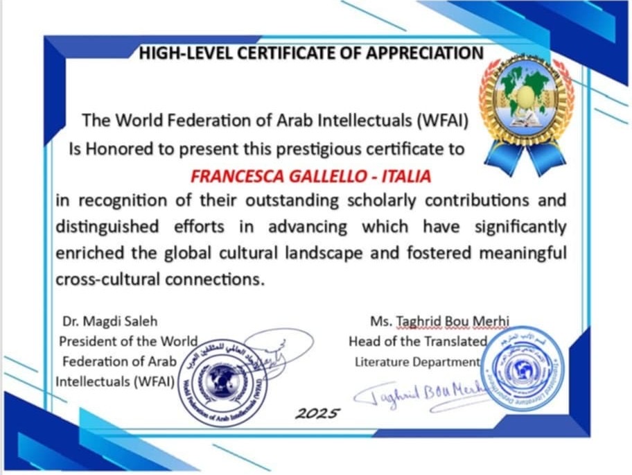 Un riconoscimento giunto da lontano, ma che parla direttamente al cuore: la World Federation of Arab Intellectuals ha conferito a Francesca Gallello Gabriel Italo Nel Gòmez, scrittrice e ambasciatrice di pace, un attestato di apprezzamento per i suoi contributi culturali e letterari nella promozione del dialogo tra popoli.