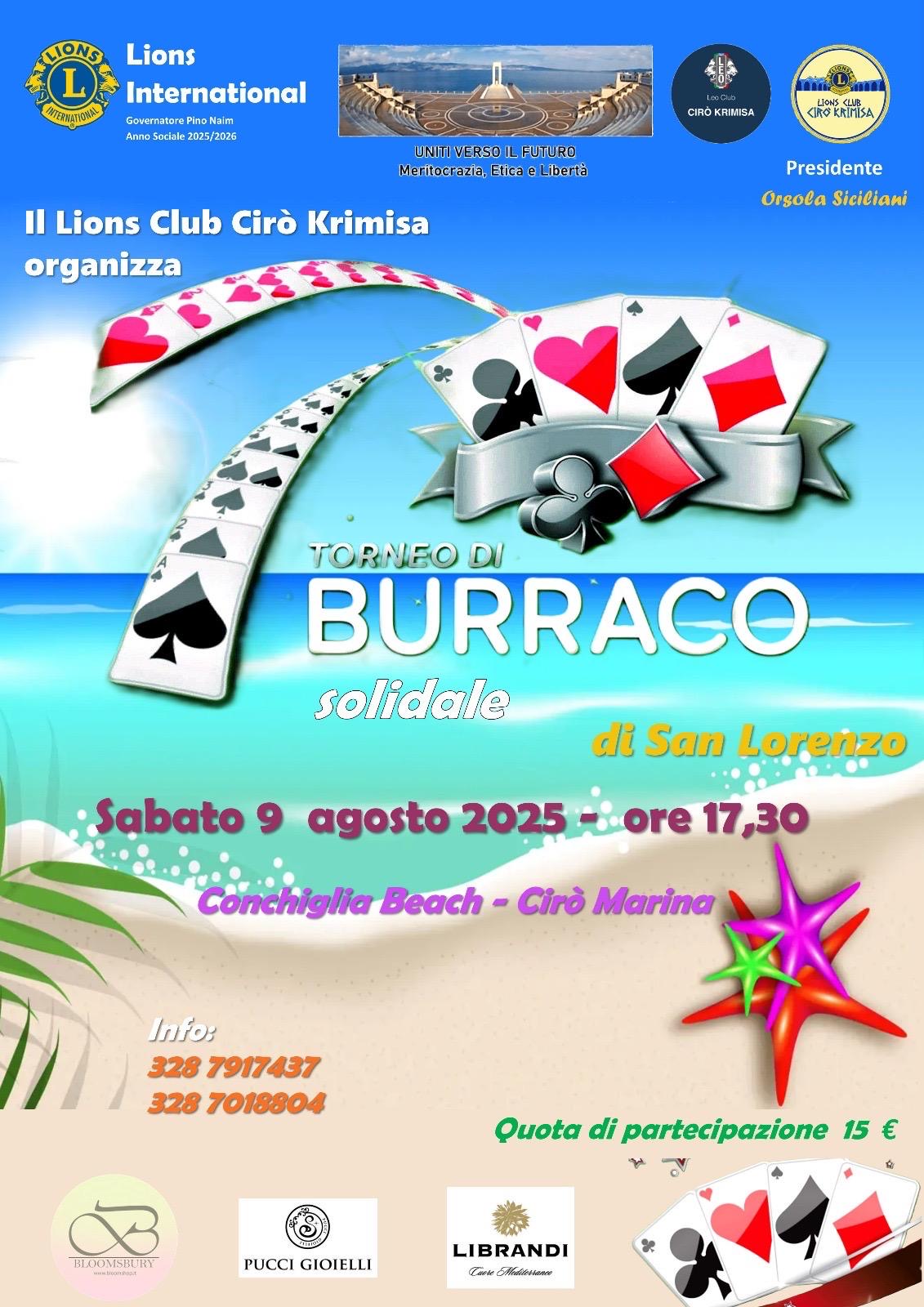 In un clima di amicizia, solidarietà e collaborazione, si è svolto alla Conchiglia Beach di Cirò Marina il Torneo di Burraco di San Lorenzo, promosso dal Lions Club CiròKrimisa.