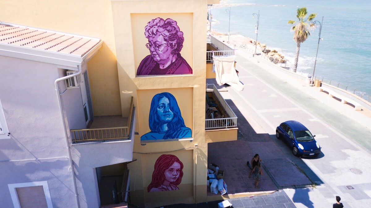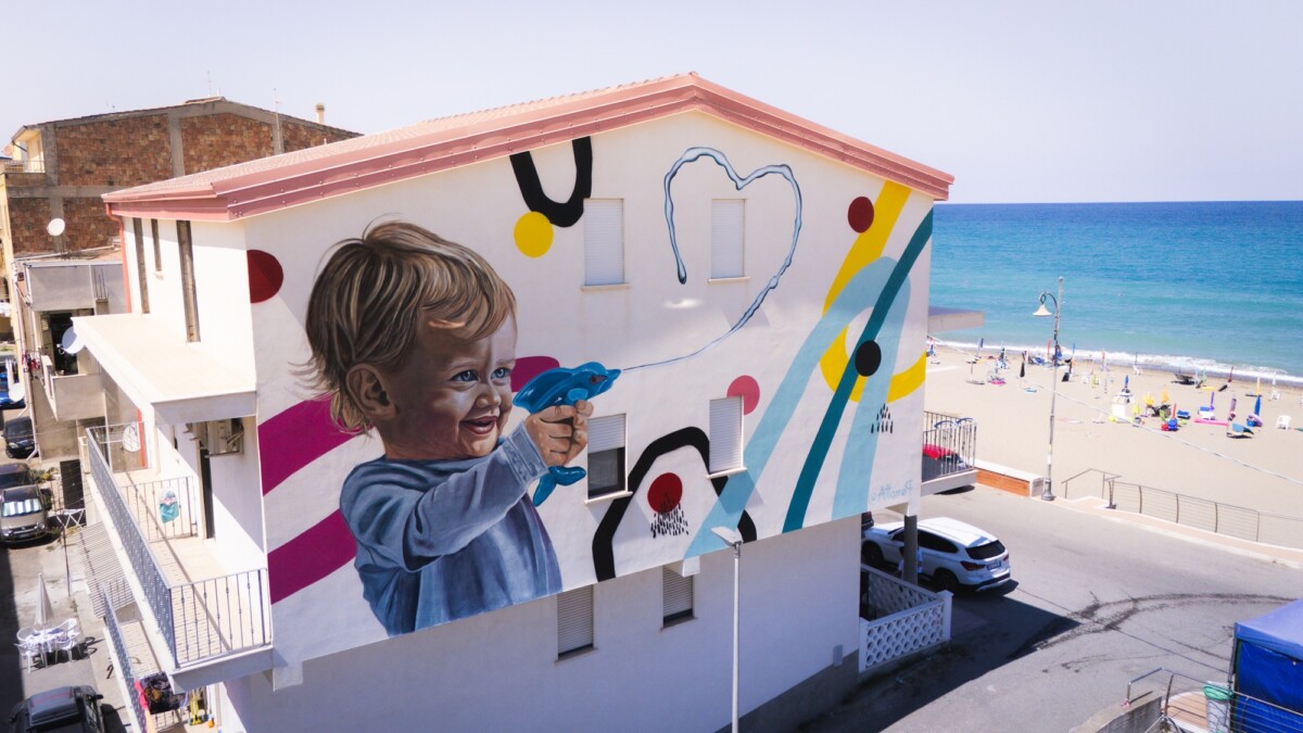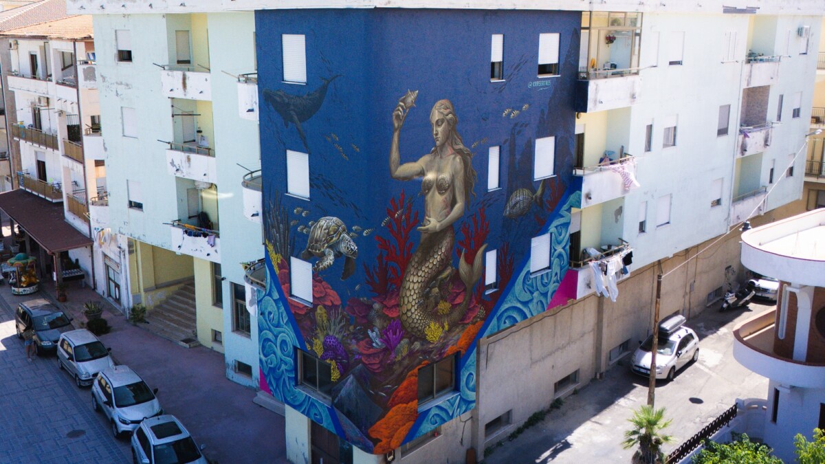 Tre artisti di rilievo internazionale e nazionale hanno lasciato un segno profondo nel paesaggio urbano. Kraser (Spagna) ha dedicato la sua opera al mare, raffigurando una sirena avvolta da coralli e circondata da tartarughe, pesci e balene: un’esplosione di dettagli iperrealistici e colori intensi che celebra la bellezza dell’ecosistema marino e invita a riflettere sulla sua tutela. Taxis (Grecia) ha invece raccontato l’identità femminile attraverso tre figure collocate verticalmente: una giovane donna con lo sguardo rivolto verso il mare, una donna matura e una donna anziana. Questo sviluppo visivo, scandito da cromie vivaci e simboliche, diventa un racconto sulla crescita, la trasmissione di saperi e la memoria collettiva, intrecciando la storia personale delle protagoniste con quella della comunità. Attorrep (Italia), calabrese e tra i più apprezzati artisti del settore a livello nazionale, ha realizzato un murale dal forte impatto emotivo, raffigurante un bambino sorridente che gioca con una pistola ad acqua dalla quale sgorga un cuore: un’immagine posizionata vicino alla spiaggia che parla di purezza, gioia e innocenza, unendo elementi realistici e forme astratte in un linguaggio poetico.