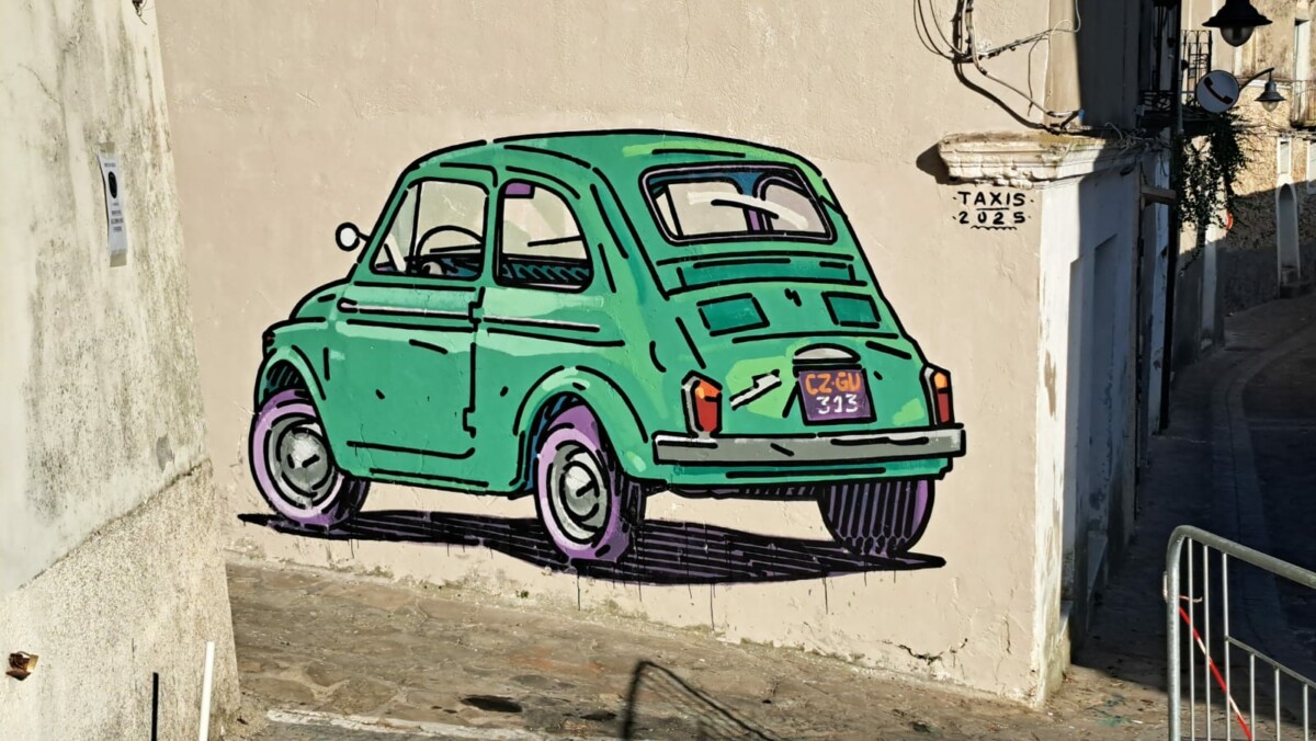 A queste opere si aggiunge un ulteriore intervento di Taxis nel cuore di Crucoli paese, che celebra uno dei simboli più iconici d’Italia: la Fiat 500, qui trasformata in un omaggio alla storia e all’immaginario collettivo nazionale.