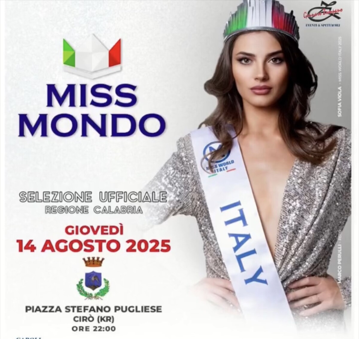 Cirò si prepara a vivere una serata di bellezza, spettacolo e glamour con l’arrivo, per la prima volta in città, di Miss Mondo, il più antico e prestigioso concorso internazionale di bellezza. La Selezione Ufficiale Regione Calabria si terrà questa sera, giovedì 14 agosto 2025, alle ore 22.00, in Piazza Stefano Pugliese.