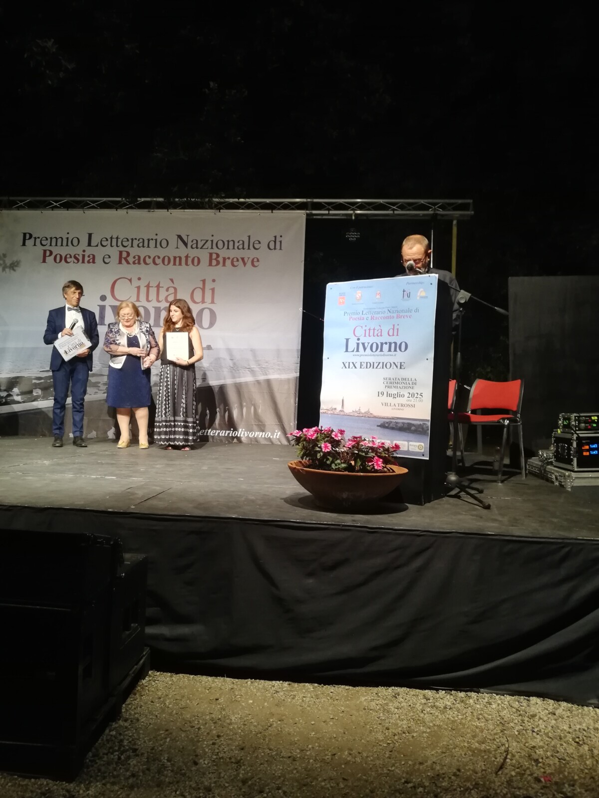 Infine, il 19.07.2025, al “Premio Letterario Nazionale Livorno” 2025, viene premiata con una appariscente medaglia di bronzo dorato. Tra moltissimi partecipanti, viene scelta un’ode dedicata al nostro paese, l’Italia, dal titolo “Lo Stivale” interamente in lingua baciata, letta da un attore professionista, Carlo Neri, sul palcoscenico con grande maestria e professionalità, provocando un fragoroso applauso (vedi e ascolta il link allegato). L’autrice fa sempre vibrare i suoi versi di sentimento e regala emozioni a chi legge e o ascolta le sue opere. Molti lettori le definiscono una carezza per l’anima, poiché l’autrice scrive con la penna intrisa di sentimenti e di passione.