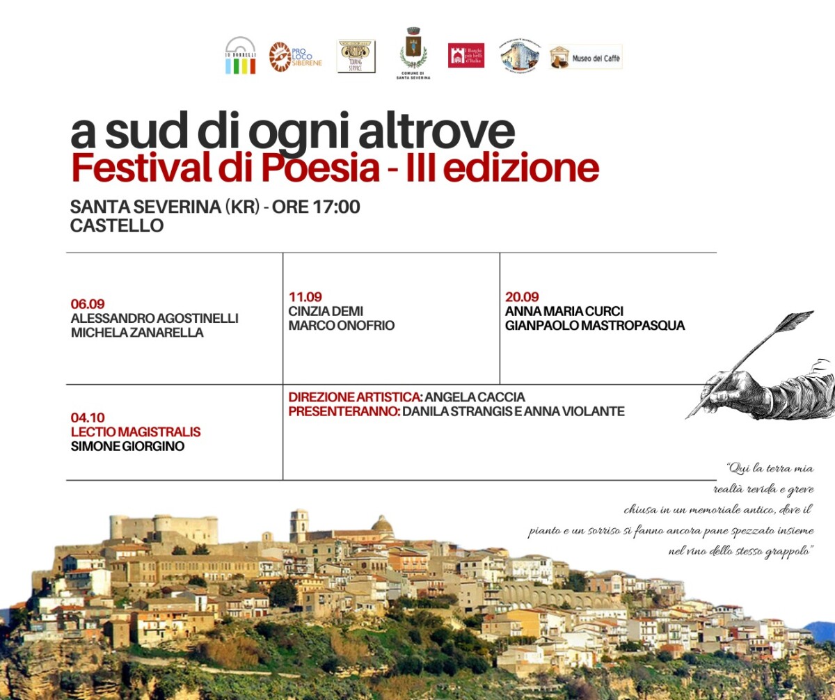 Santa Severina. Il Comune, col Sindaco Dr. Salvatore Giordano e la sua Amministrazione, è lieto di annunciare la terza edizione del festival di poesia “A Sud di Ogni Altrove”, che si svolgerà nel suggestivo e storico scenario del Castello di Santa Severina. L’evento, in programma il 6, 13, 20 settembre e il 4 ottobre, è curato artisticamente dalla poetessa Angela Caccia e gode della collaborazione di importanti realtà locali, quali l’Associazione dei Borrelliani, il Museo Letterario del Caffè, la Pro Loco Siberene, la Cooperativa Aristippo e il Liceo Classico Diodato Borrelli. Anche quest’anno, il festival – presentato dalla Professoressa Danila Strangis che sarà coadiuvata, nella lettura dei brani, dalla dottoressa Anna Violante -, intende celebrare la poesia come strumento fondamentale di connessione tra passione, emozione e riflessione, in un momento storico in cui il valore dell’umano sembra essersi smarrito.