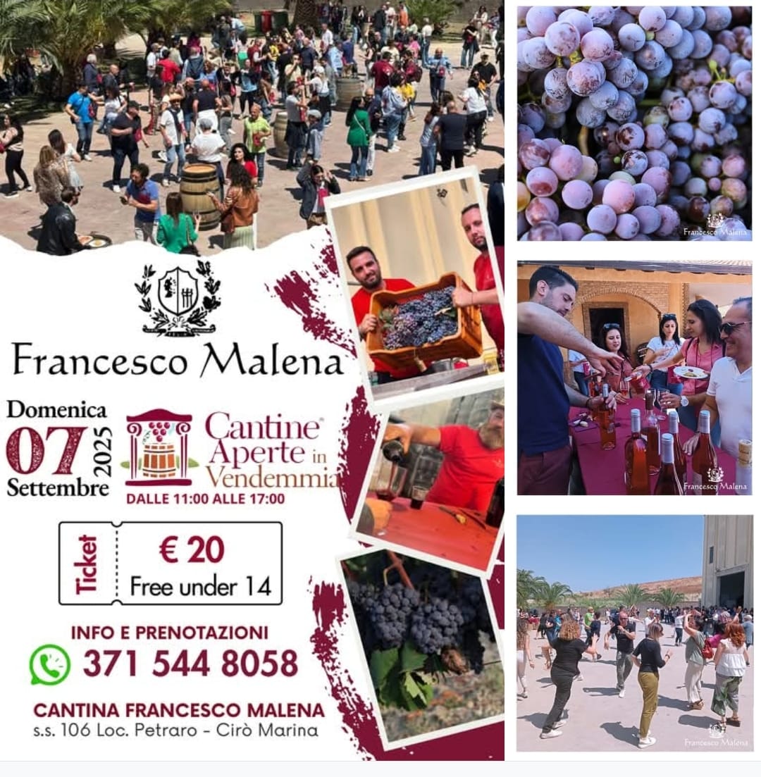 Domenica 7 settembre 2025, la Cantina Francesco Malena di Cirò Marina apre le sue porte al pubblico per un evento unico dedicato alla vendemmia e alla tradizione vitivinicola calabrese. Dalle 11:00 alle 17:00, infatti, si terrà la giornata “Cantine Aperte in Vendemmia”, un’occasione speciale per vivere da vicino l’atmosfera della raccolta dell’uva, scoprire i segreti della produzione del vino e degustare le eccellenze del territorio.