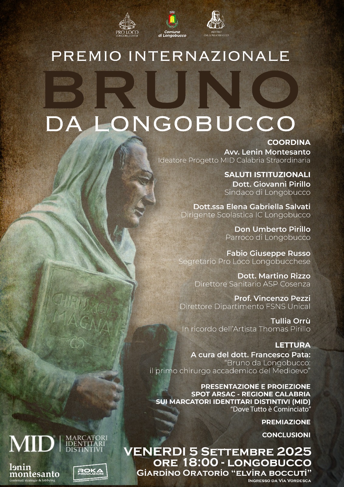 LONGOBUCCO (Cs), giovedì 4 settembre 2025 – Ricollocare Bruno da Longobucco, il più grande chirurgo del Medioevo, tra i grandi riformatori della medicina, padre della chirurgia moderna, autore del trattato (Chirurgia Magna) più letto e tradotto nell’Europa Medievale, in italiano, francese, tedesco e due edizioni in ebraico, nel suo contesto storico e in relazione ai chirurghi accademici del XIII e XIV secolo. Promuovere uno studio sistematico delle opere minori; identificare e correggere i cliché e le errate convinzioni sul medioevo e la medicina medioevale («Ecclesia abhorret a sanguine»). Restituire a Bruno il ruolo che merita nella storia della Medicina attraverso iniziative pubbliche e opere editoriali.