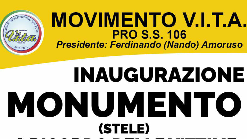 TORRE MELISSA – Era prevista per il prossimo 3 ottobre 2025 l’inaugurazione del monumento (stele) dedicato alle vittime della S.S. 106, promosso dal Movimento V.I.T.A. Pro S.S. 106 guidato dal presidente Ferdinando (Nando) Amoruso. La cerimonia si sarebbe dovuta svolgere nell’ex area Palazzo Mangeruca, sulla S.S. 106 a Torre Melissa, alla presenza di autorità civili, militari e religiose.